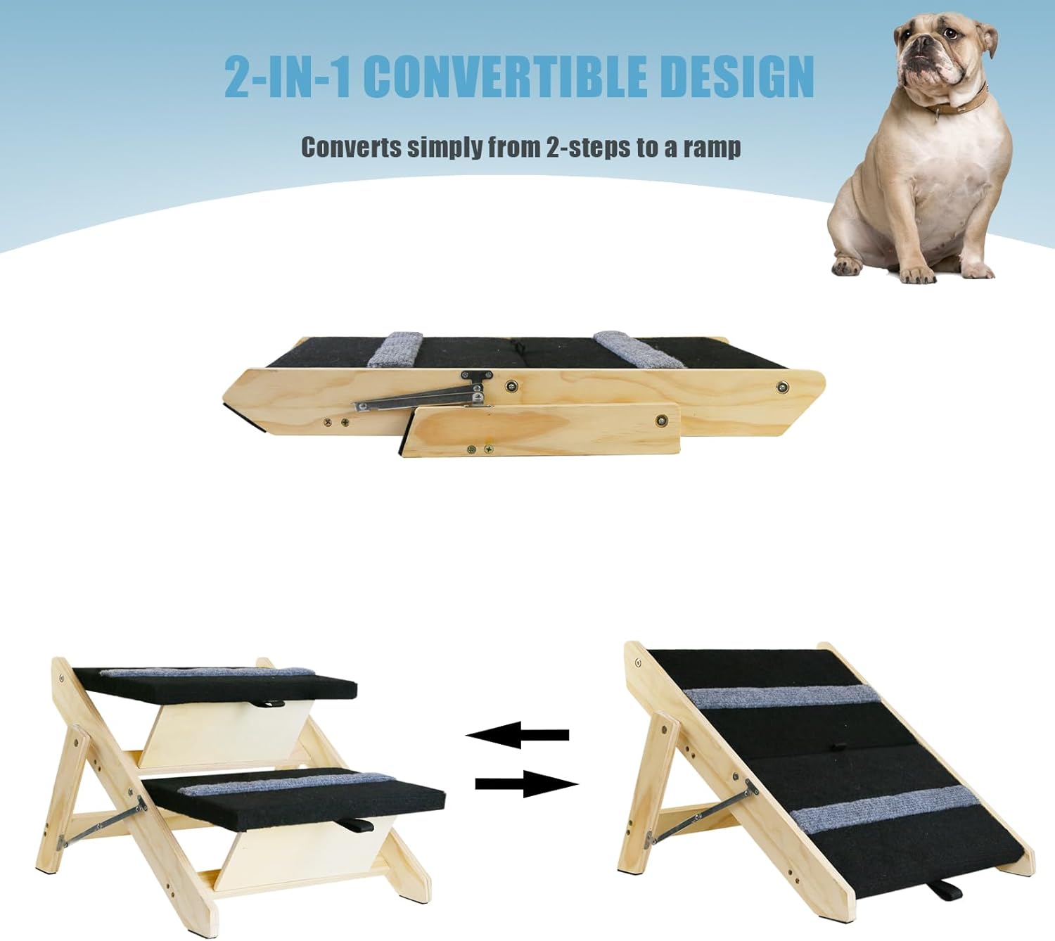 2-in-1 Indoor Pet Ramp, Wooden Folding 2-Tier Pet Stairs with Non-Slip Carpeted Steps, Ramp Perfect for Bed and Couch