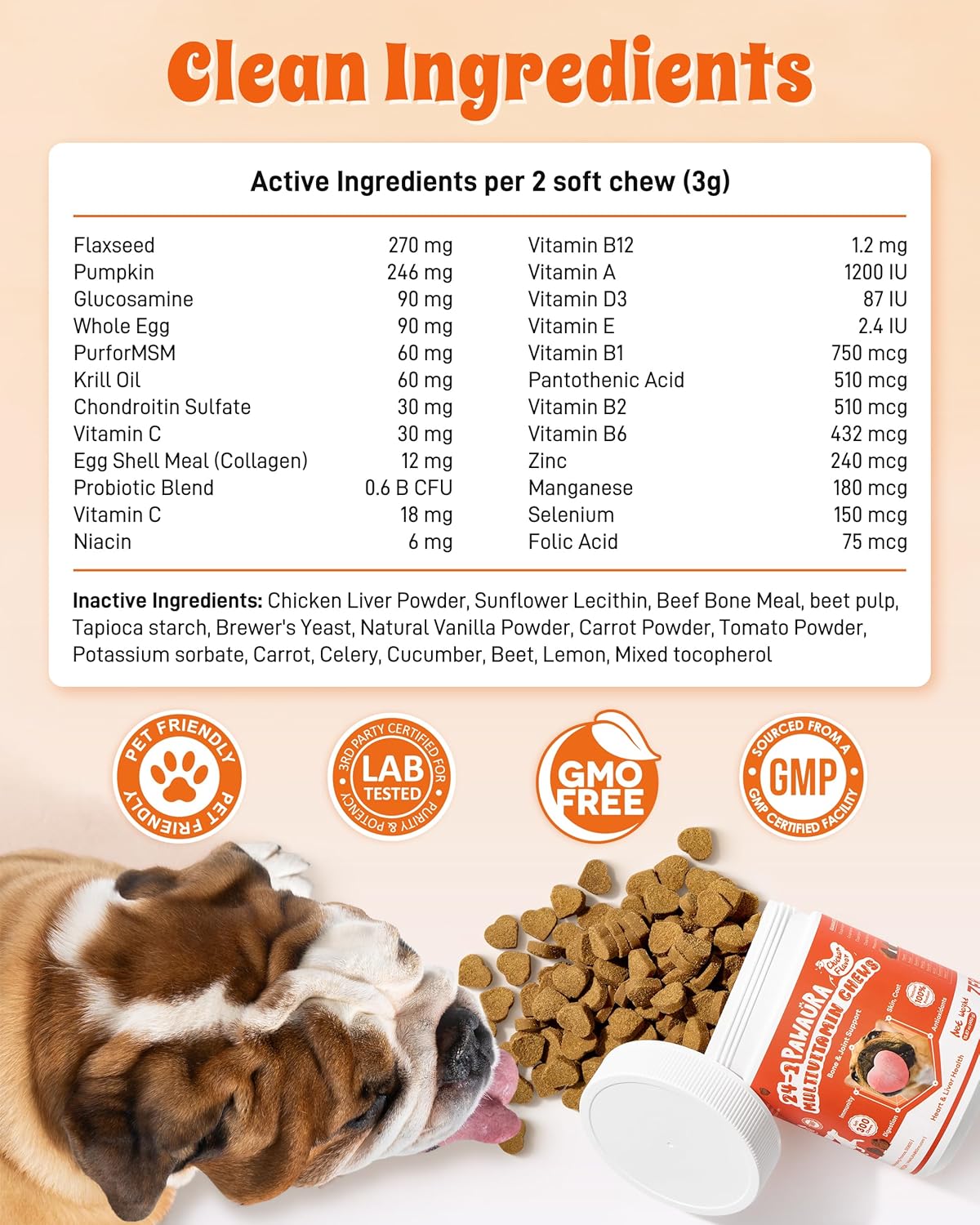 【QUALITY FORMULA & CLEAN INGREDIENTS】Made with thoughtfully selected ingredients and produced in a GMP-certified facility. Non-GMO, corn-free, wheat-free, and soy-free, with no artificial colors or flavors. Carefully crafted to support long-term daily wellness for puppies, adult dogs, and senior dogs alike.