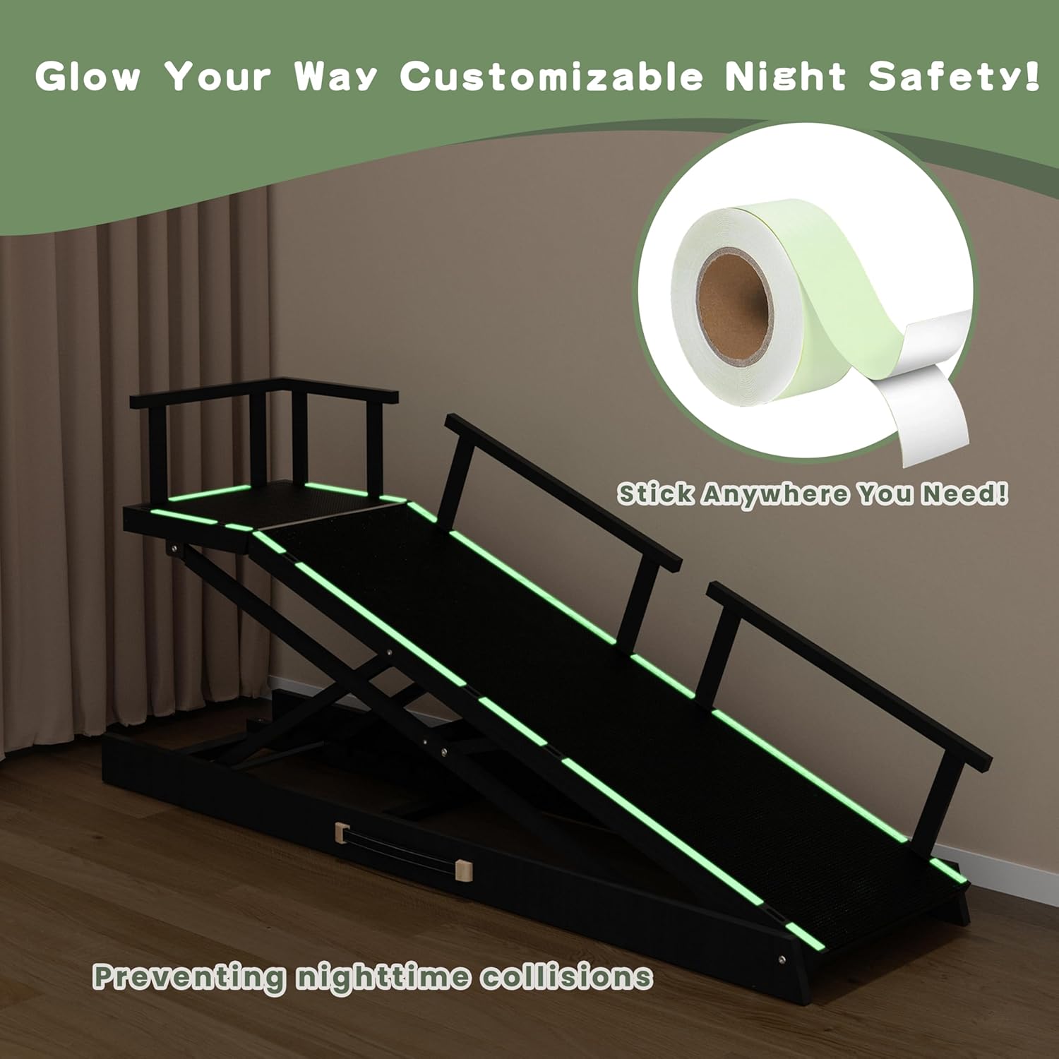 🛡️ Triple Safety System Seamless removable guardrails (3 side panels) prevent falls, paired with Anti-Slip Anchor Straps to secure ramp base. Includes DIY glow strips for enhanced nighttime visibility and safety.
