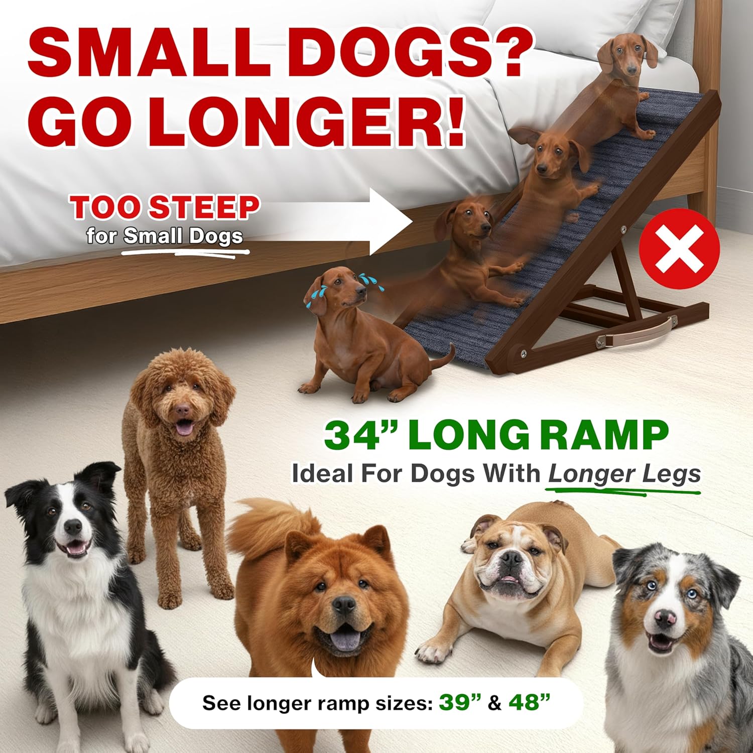 ADJUSTABLE AND VERSATILE – With a sleek 34″ frame and 4 height levels (10″–17″), this ramp fits right into your space. The 12.6″ wide walking surface offers the perfect balance of comfort and compactness.