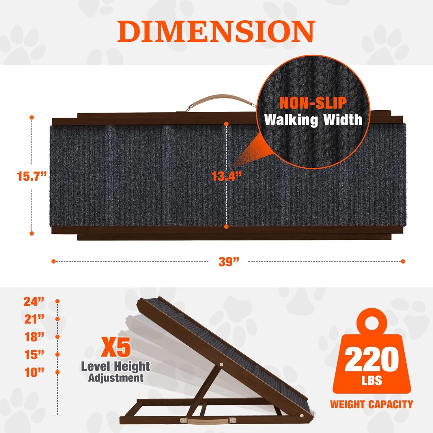 ADJUSTABLE AND VERSATILE – With a sleek 39.3″ frame and 5 height levels (10″–24″), this ramp fits right into your space. The 13.4″ wide walking surface offers the perfect balance of comfort and compactness.