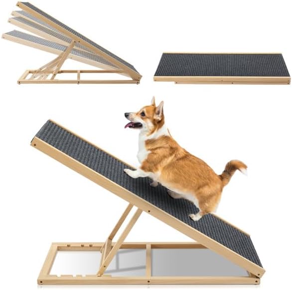 Every pet deserves the freedom to explore their favorite spots without pain or hesitation. This cleverly designed ramp helps your loyal companion regain independence while protecting their joints from unnecessary strain. Picture your dog confidently stepping onto the couch or hopping into the car with no lifting or awkward maneuvers required. Crafted from robust pine wood, it combines natural strength with a refined finish that complements any home. The soft textured surface prevents slipping, giving your furry friend steady footing whether climbing toward a cozy bed or heading out for an adventure. With four adjustable height levels, it easily matches different furniture or vehicle types, offering consistent comfort every time. When not in use, the ramp folds flat, sliding neatly under a sofa or into a trunk for tidy storage. Non-slip base pads add extra grip to keep things stable on any surface. Perfect for large breeds, seniors, or small pets needing gentle access, this ramp brings daily confidence and comfort back to their steps.