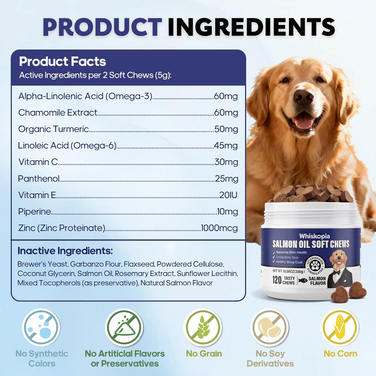 Natural Ingredients: Our chewable allergy supplement for dogs are crafted with premium ingredients like Omega-3, Omega-6, Chamomile Extract, Turmeric, Piperine, Vitamin C&E. Recommended for daily maintenance to provide high-quality support for your dog’s skin & coat and overall well-being.