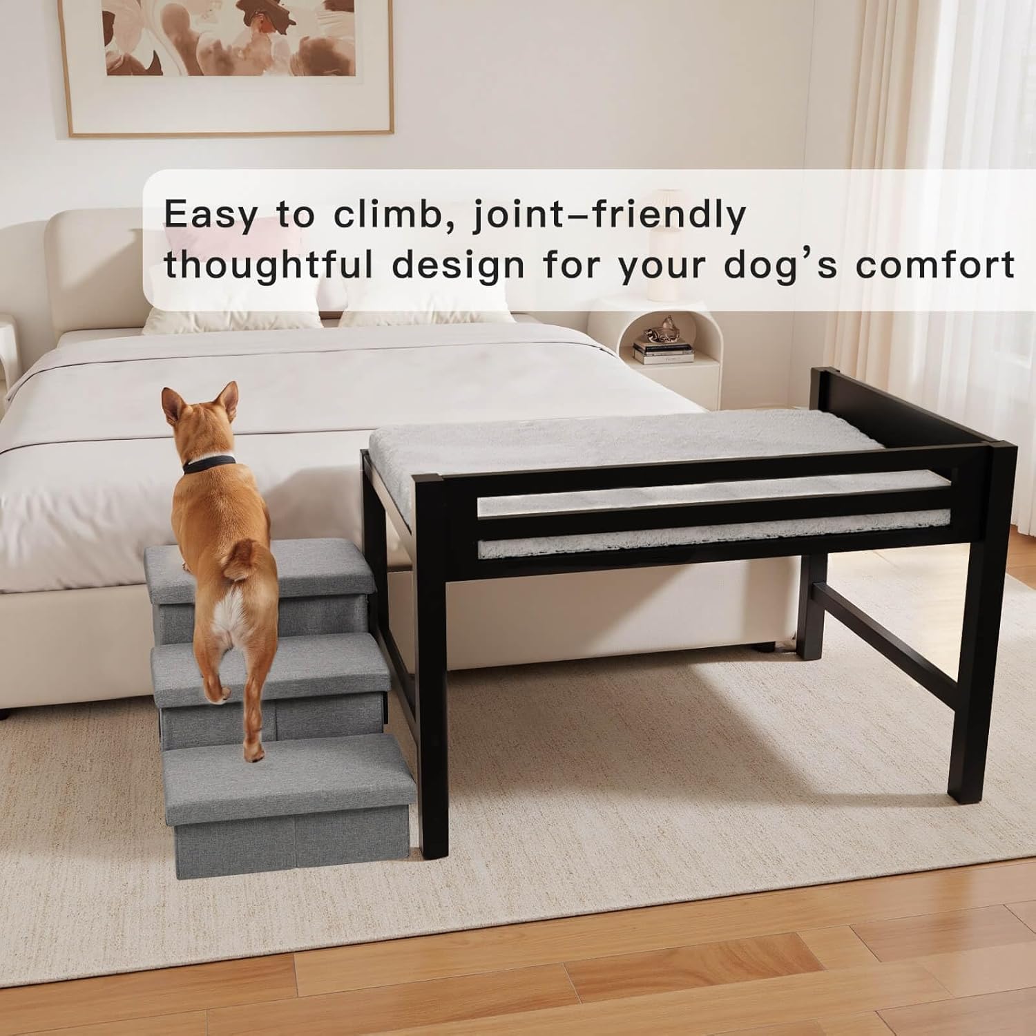 Inspired by Real Life Born from the desire to let pets sleep close without taking over the bed, Pet Cosleeper is designed for true companionship.Thoughtful Design From the sturdy black wood frame to the foldable gray stairs and soft cushion, every detail supports both comfort and safety.