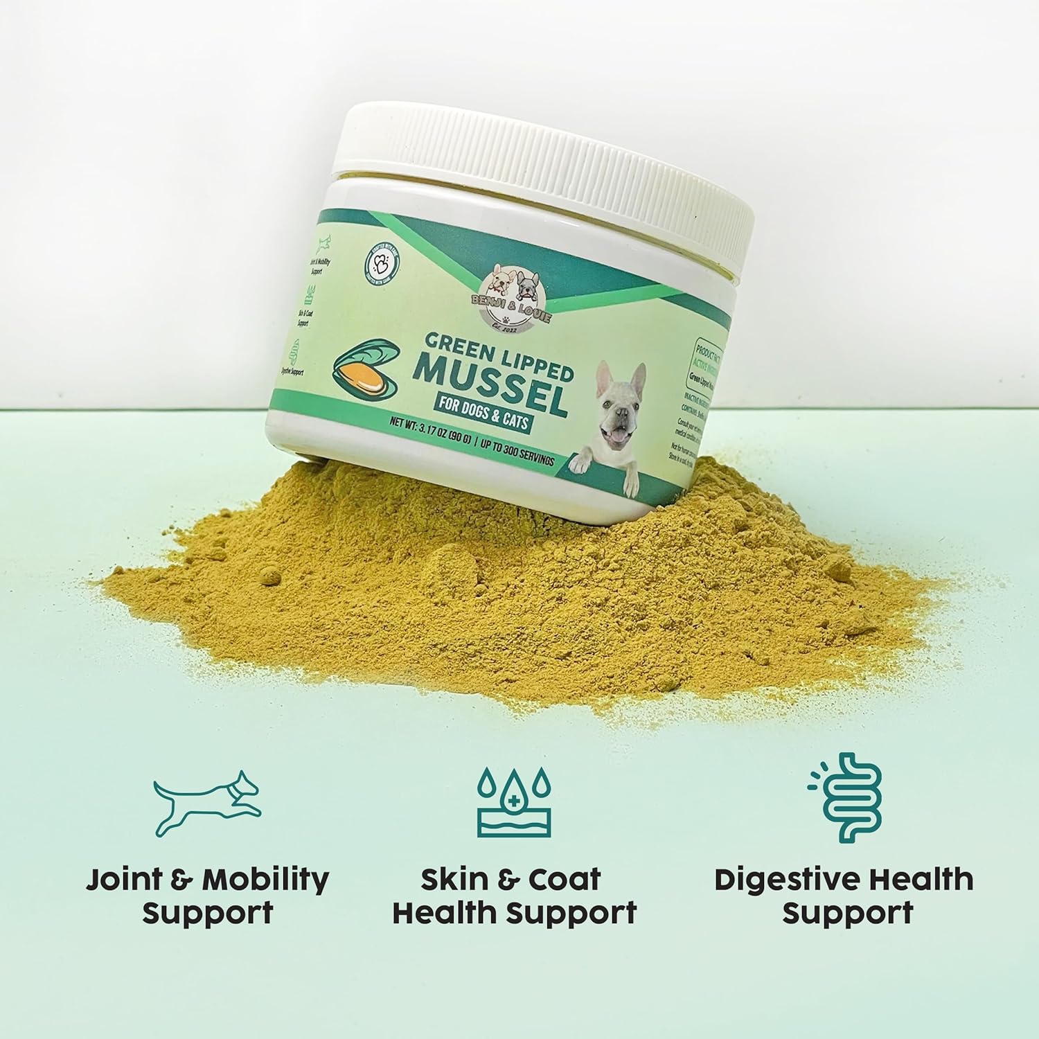 Benji & Louie Green Lipped Mussels Powder for Dogs and Cats 3.17 oz (90g) – 300 Servings – Sourced from USA – Rich in Omega-3 Fatty Acids for Joint, Skin & Coat Health, Made in USA