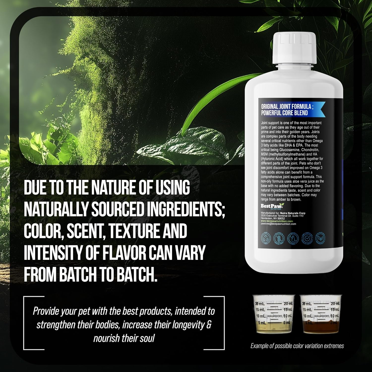 Complete Joint Support Formula: Contains a natural combination of key nutrients to support cartilage, connective tissue, and joint health: Glucosamine, Chondroitin, MSM, Hyaluronic Acid, and Manganese. Supports soft tissue health and overall mobility for cats and dogs