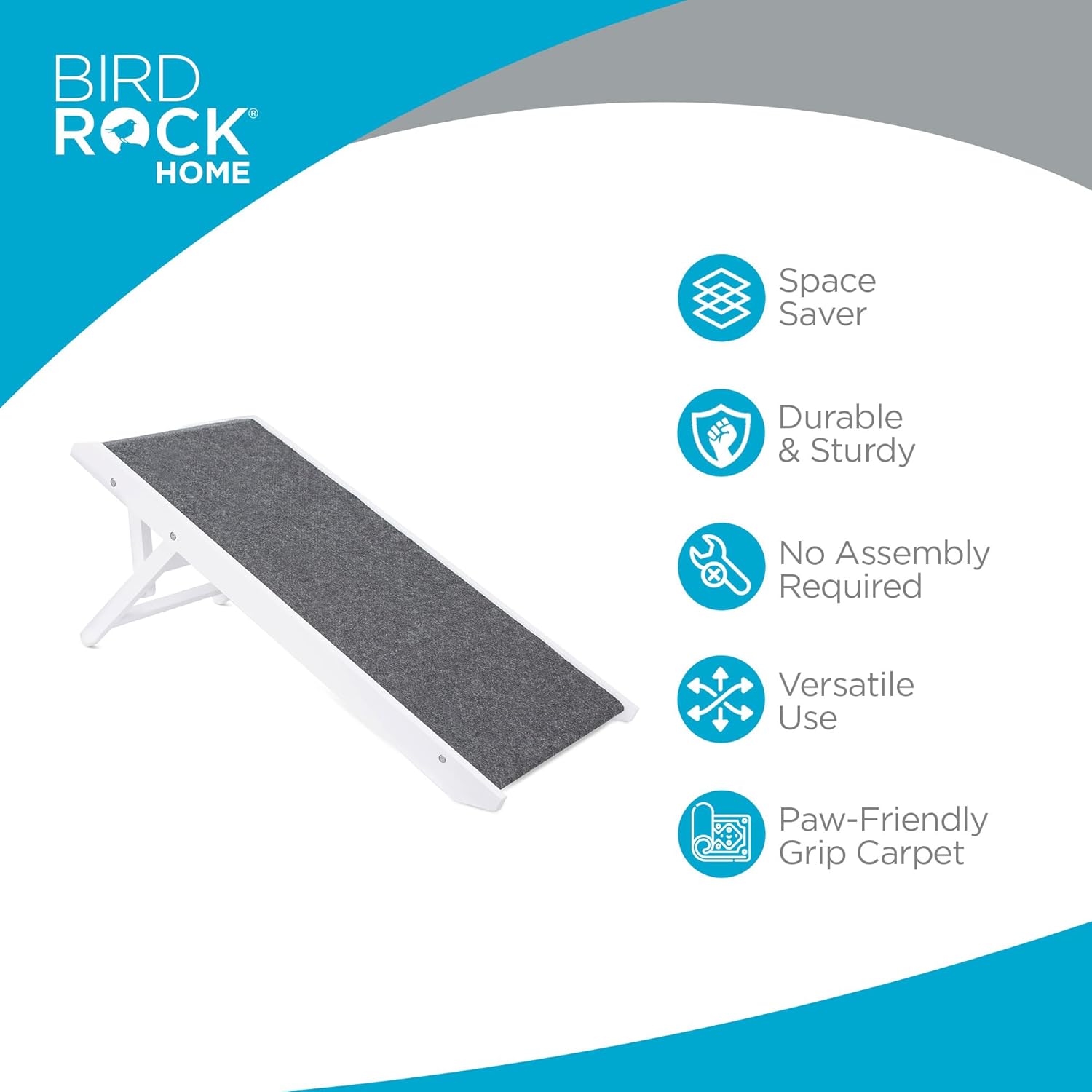 BIRDROCK HOME 16” Adjustable Pet Ramp is the perfect ramp for pets (dog, cat, puppy) who need extra help climbing into the car, sofa, bed, couch, small stairs, or ledges. The pet ramp is built with a simple design offering a soft accent to any room. The ramp is also sturdy enough to hold up to 75 lbs. Each pet ramp is crafted with durable, paw-friendly grip carpet for added traction and comfort. The grip carpet is designed to keep your pet from slipping when on the ramp. The Pet steps may be adjusted to 3 different heights—12, 14 & 16 Inches. When not in use, collapse the pet ramp down to 2” height for easy storage.