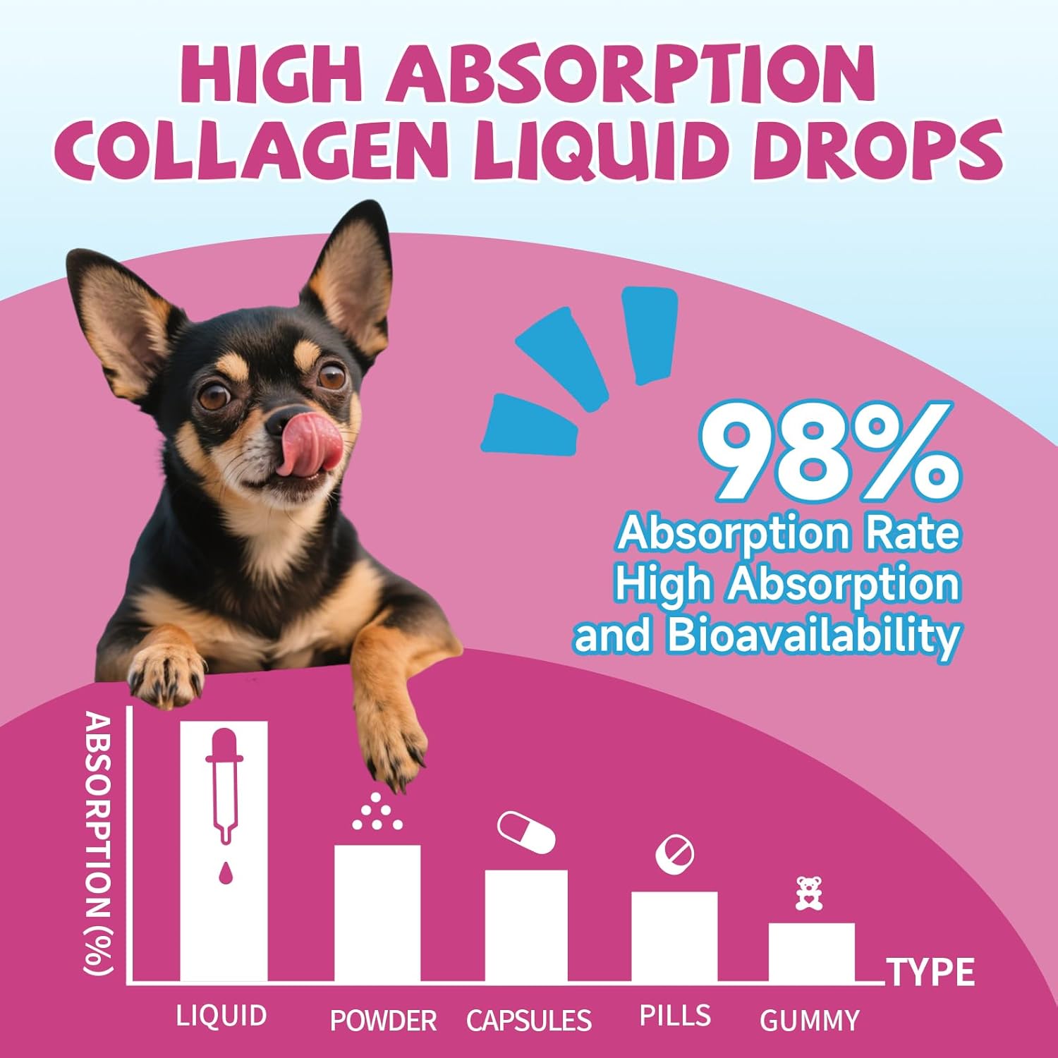 FAST ABSORPTION: Our liquid collagen supplement formula absorbs faster than chews or pills, and the benefits last longer. For maximum effects, simply administer it daily into your dog’s mouth or mix into your dog’s food. The liquid form ensures quick and effective absorption, providing your dogs of all breeds, sizes and ages with the nutrients they need