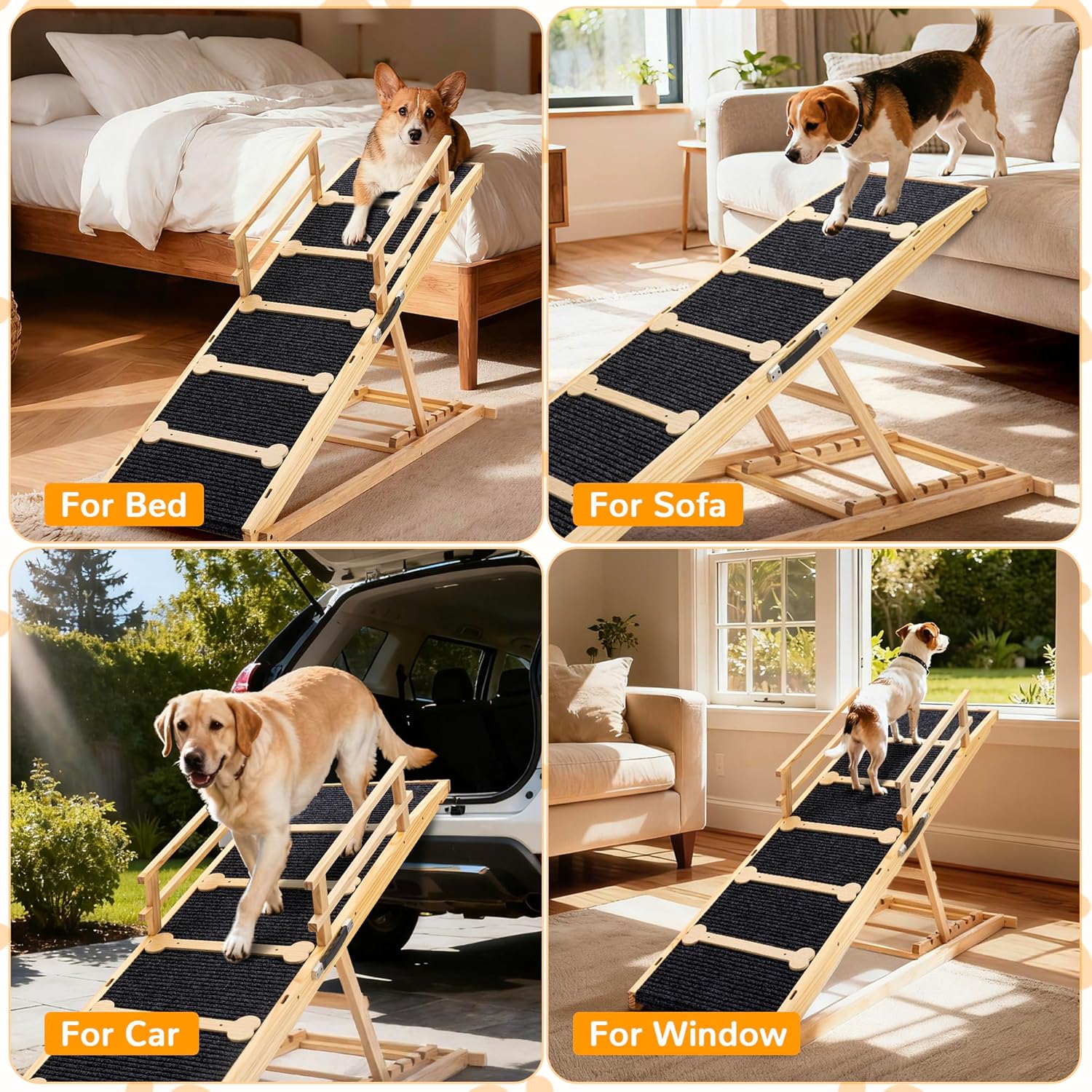 Stable Pine Wood Frame: Crafted from durable solid pine wood, the ramp supports up to 200 lbs. The surface features a non-slip felt mat and bone-shaped wooden steps to enhance grip and attract dogs to climb confidently. Perfect for indoor use as a dog ramp for couch or bedroom.