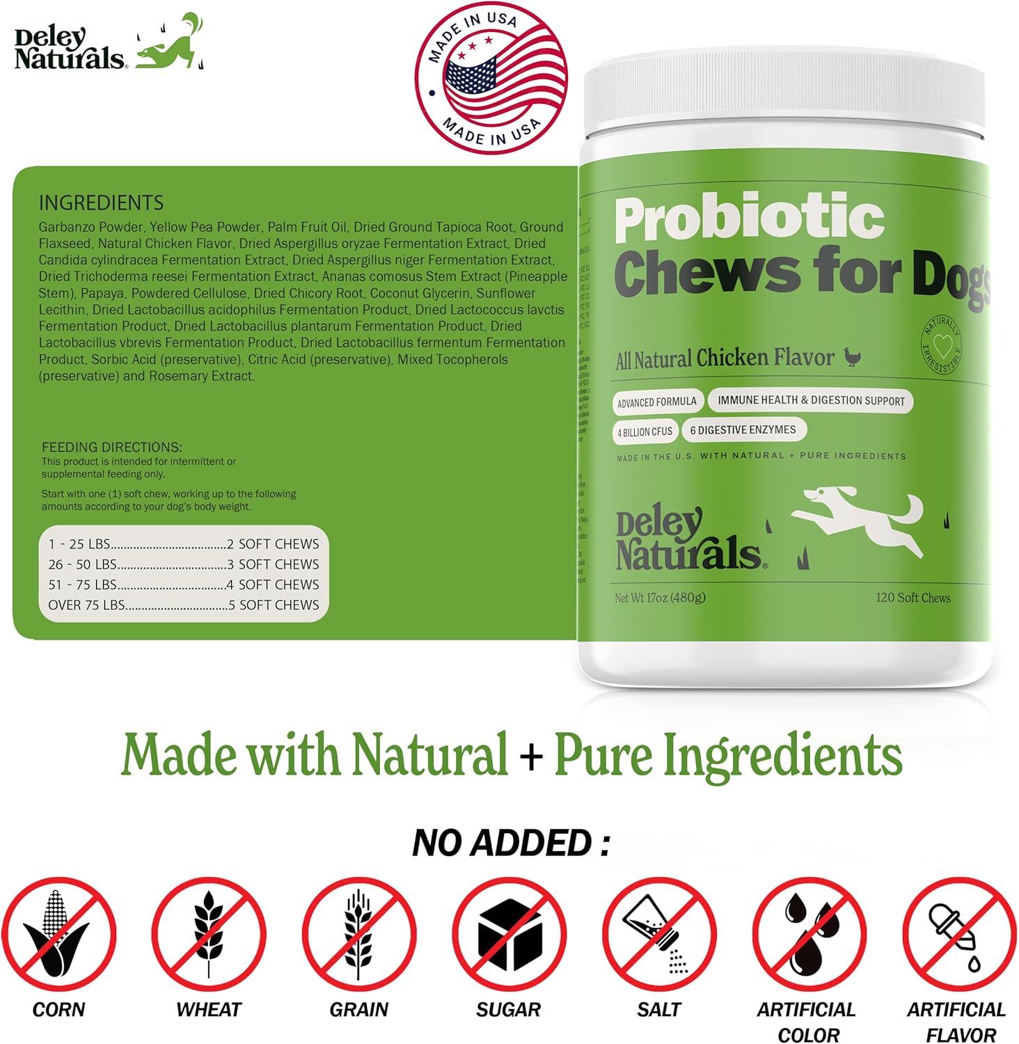 Deley Naturals Dog Probiotic Chews – Dogs Probiotic for Digestive Health with 4 Billion CFUs & Digestive Enzymes – Anti Diarrhea for Dogs – Dog Gut Health Probiotics for Allergies – Made in The USA