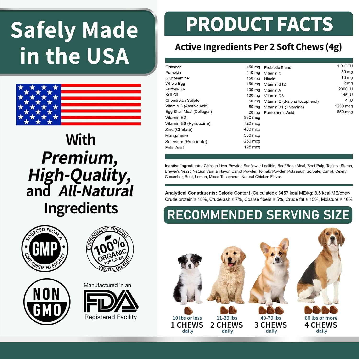 Whether your dog is young and active or older and needs extra support, these chews will keep them moving comfortably and confidently. Promotes Digestive Health with Probiotics Each chew contains 1 billion CFU of probiotics and pumpkin, promoting a healthy digestive system. By aiding digestion and preventing common issues like diarrhea, vomiting, and upset stomach, these chews ensure your dog feels its best every day. A healthy gut means a happier, more energetic pet. Nourishes Skin & Coat with Omegas Enriched with eggshell meal and krill oil omegas, these chews provide the vital nutrients needed to soothe dry, itchy skin and promote a stronger, shinier coat. Your dog will not only look healthier but feel healthier too, from head to tail. Boosts Immunity & Heart Health A potent blend of Vitamins A, C, and D3, known for their anti-inflammatory and antioxidant properties, supports a robust immune system and cardiovascular health. The delicious soft chews make it easy to give your dog the care they deserve, ensuring they stay strong and vibrant.