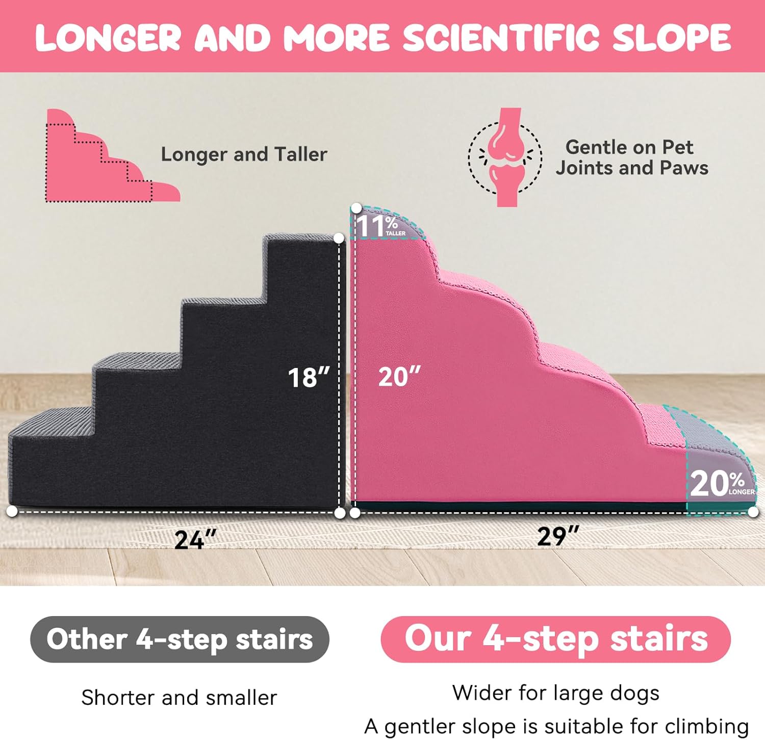 Size-Specific Design: Please use Zerbuger foam dog stair 3-steps for chairs and couches up to 20inch. 4-steps are suitable for high sofas, beds and window up to 25inch. Please confirm whether the size is suitable for your love pet first.