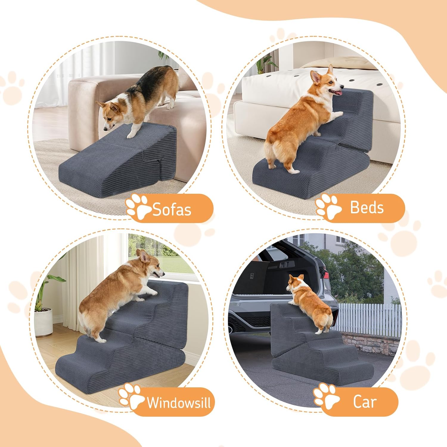 Dual Anti-Slip Safety System: Designed with safety first in mind — the non-slip base grips firmly to the floor, while the soft corduroy surface provides extra traction for steady climbing. These pet steps ensure maximum stability and comfort, even for energetic small dogs.