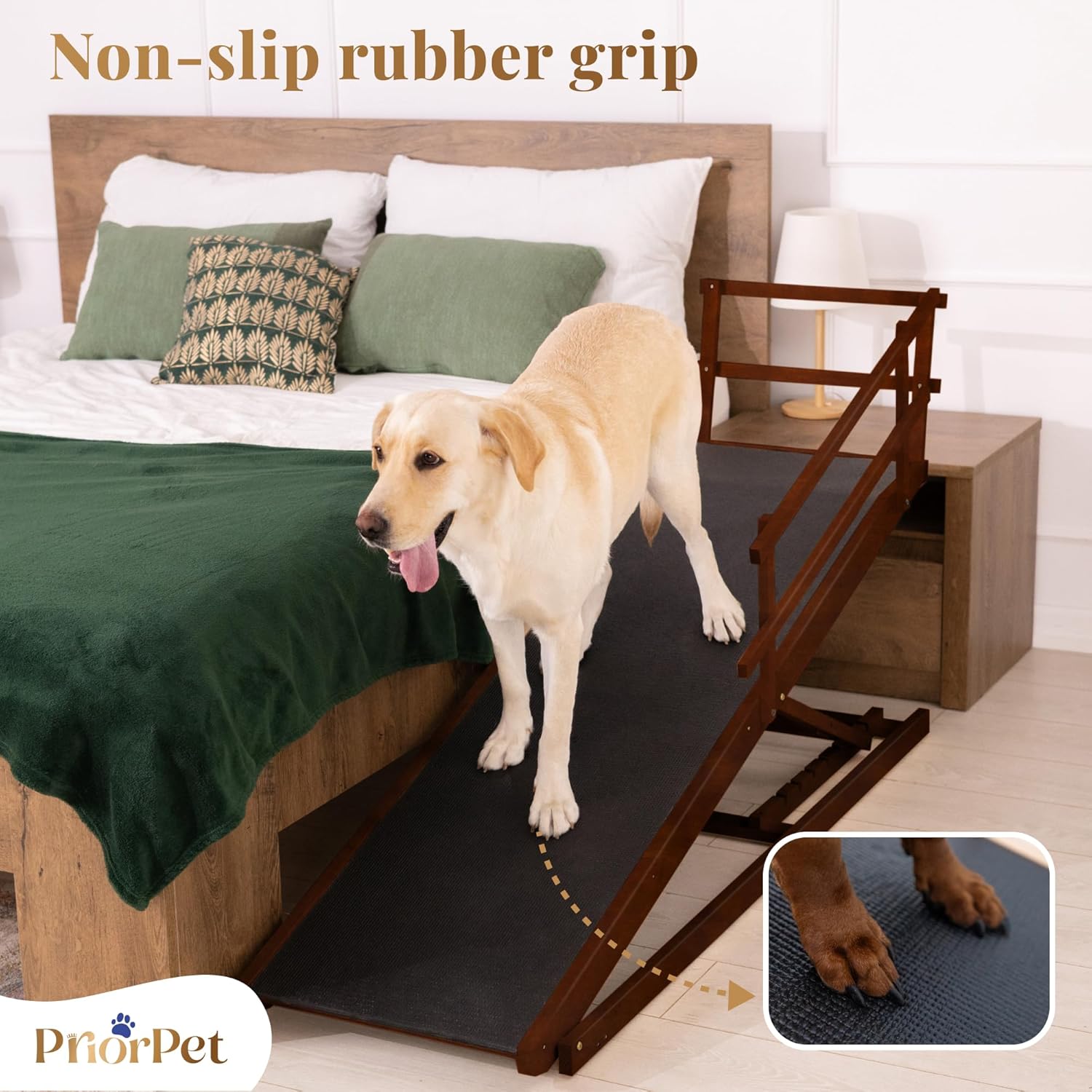 NON-SLIP RUBBER SURFACE: The anti-slip rubber surface ensures maximum traction and secure footing, outperforming traditional carpet ramps. It prevents slips and gives your dog a safe, confident climb — especially important for higher beds.