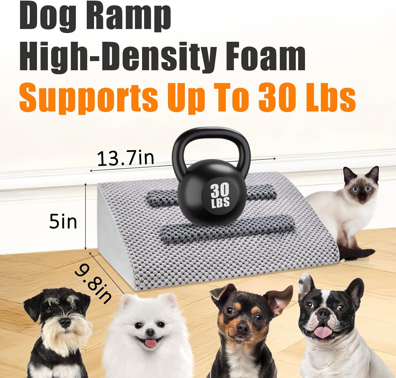 40D High-Density Foam with Reliable Support – Our dog ramp for stairs is crafted from premium 40D high-density foam, certified by OEKO-TEX Standard 100 for safety and durability. It delivers firm, consistent support while remaining gentle underfoot, helping small dogs, puppies, short-legged breeds (dachshund, corgi, pug, bulldog), senior pets, and cats move comfortably without stressing joints. Designed for pets up to 30 lbs, each step feels steady and reassuring