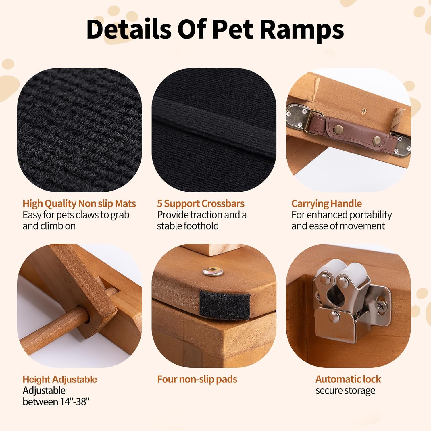 【Adjustable Heights & Easy Storage】This 64” long wooden dog ramp offers 7 height adjustments from 14” to 38”, making it suitable for beds, couches, and even cars. The gentle slope allows dogs of all sizes to climb comfortably. When not in use, the ramp folds down to just 5.5” high, so you can easily store it under the bed, sofa, or in tight spaces. It comes with a handle and side lock for convenient carrying, and is fully assembled, ready to use right out of the box.
