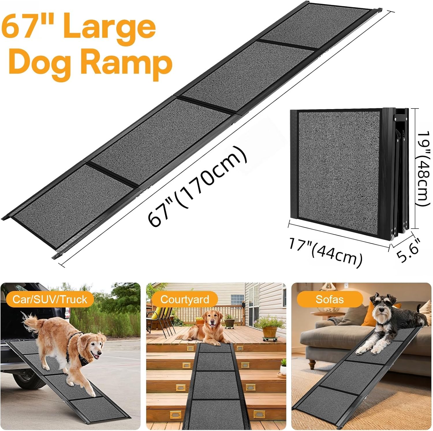 Extra-Long Gentle Angle for Joint Protection: Our extra-long dog ramp for trucks is increased to 67 inches and a width of 17 inches, which is easier on your pet’s joints than shorter ramps. The gentle angle ramp better reduces the dog’s muscle and joint straining caused by jumpingmaking it ideal for senior dogs, disabled pets, and post-surgery recovery. With a 17″ extra-wide design, even giant breeds can use it.