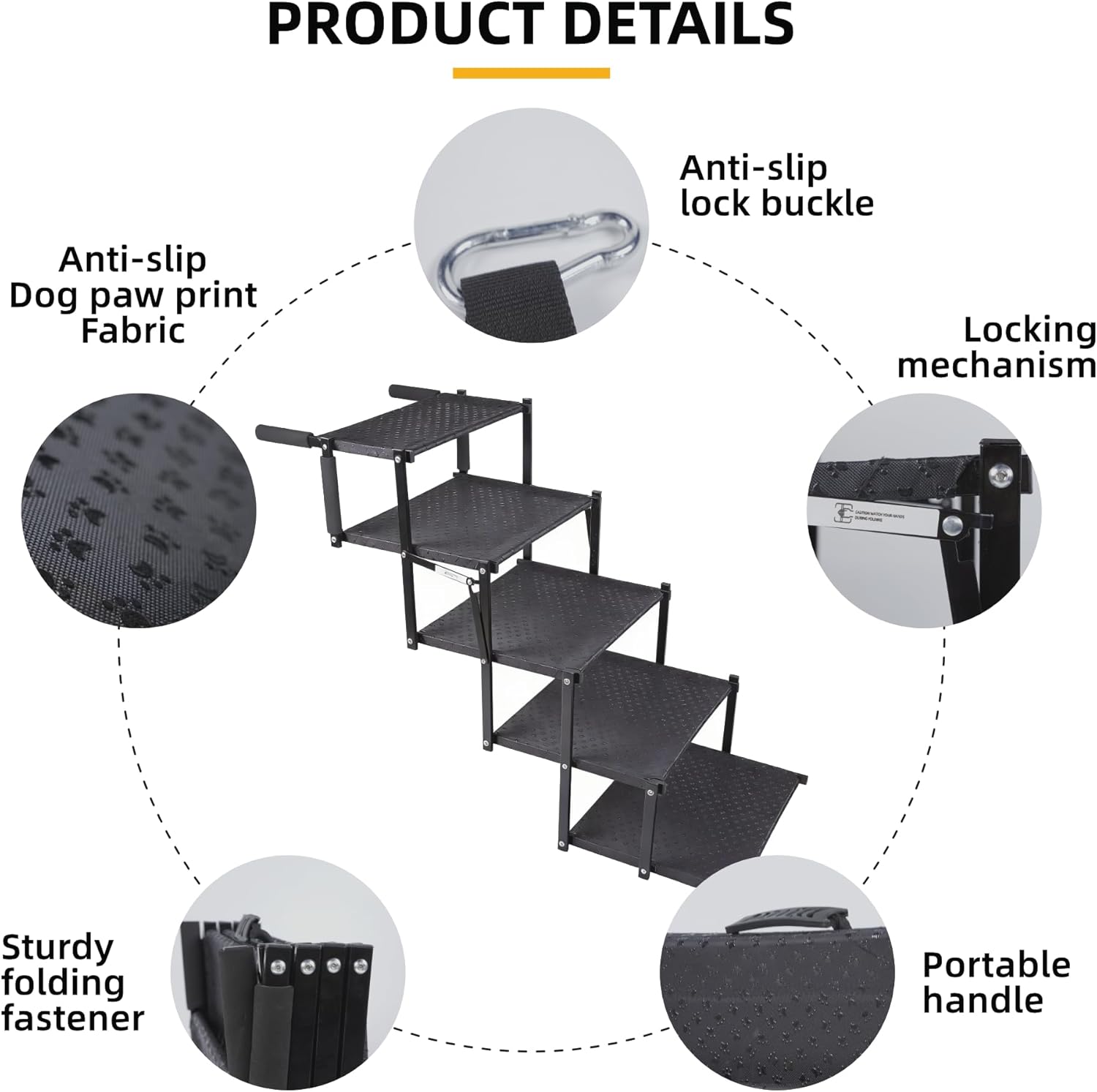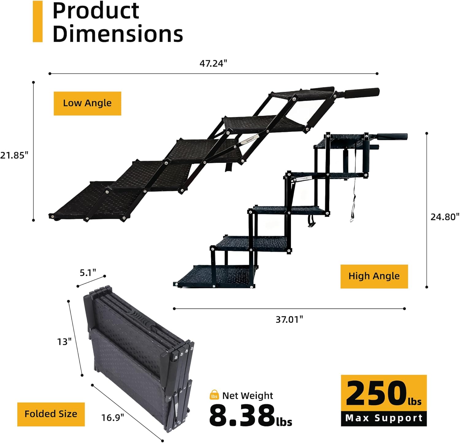 lightweight portable & Instant Setup:Weighing only 8.38 lbs, these 5 Steps foldable dog stairs collapse into an ultra-compact size 43*13*33cm, featuring a padded carry handle for easy transportation. They store effortlessly in any car trunk or closet, taking up minimal space. The simple, tool-free setup allows you to have a safe ramp ready in seconds, making it a must-have for spontaneous travel, vet visits, and daily adventures