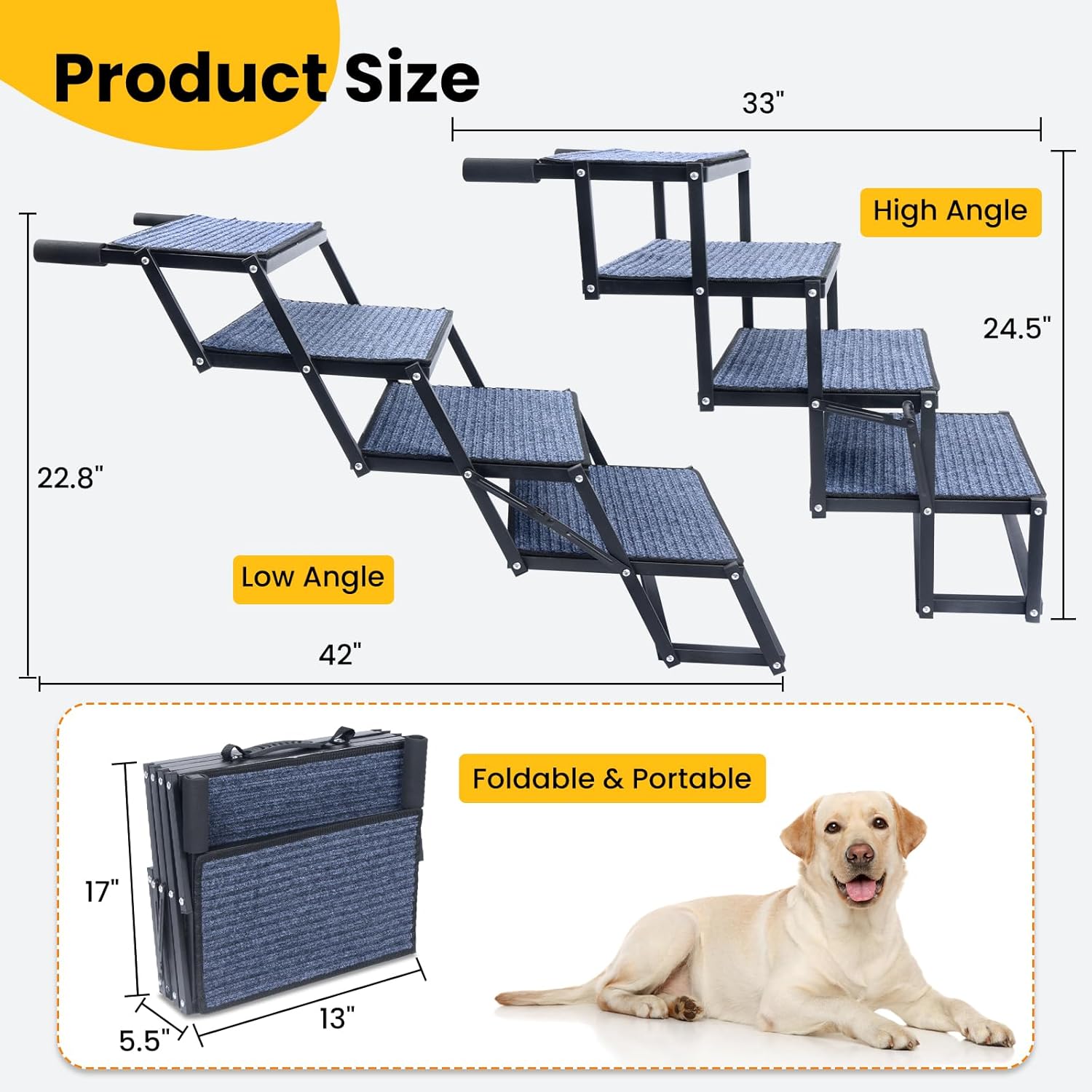 Foldable & Portable: Dog steps for car can be folded to 17″ x 13″ x 5.5″ for easy storage without taking up much space, and an integrated padded handle for carrying. Height adjustable range of 22.8″ – 24.5″, adjustable length range of 33″ – 42″. It can be adjusted to the right height as needed