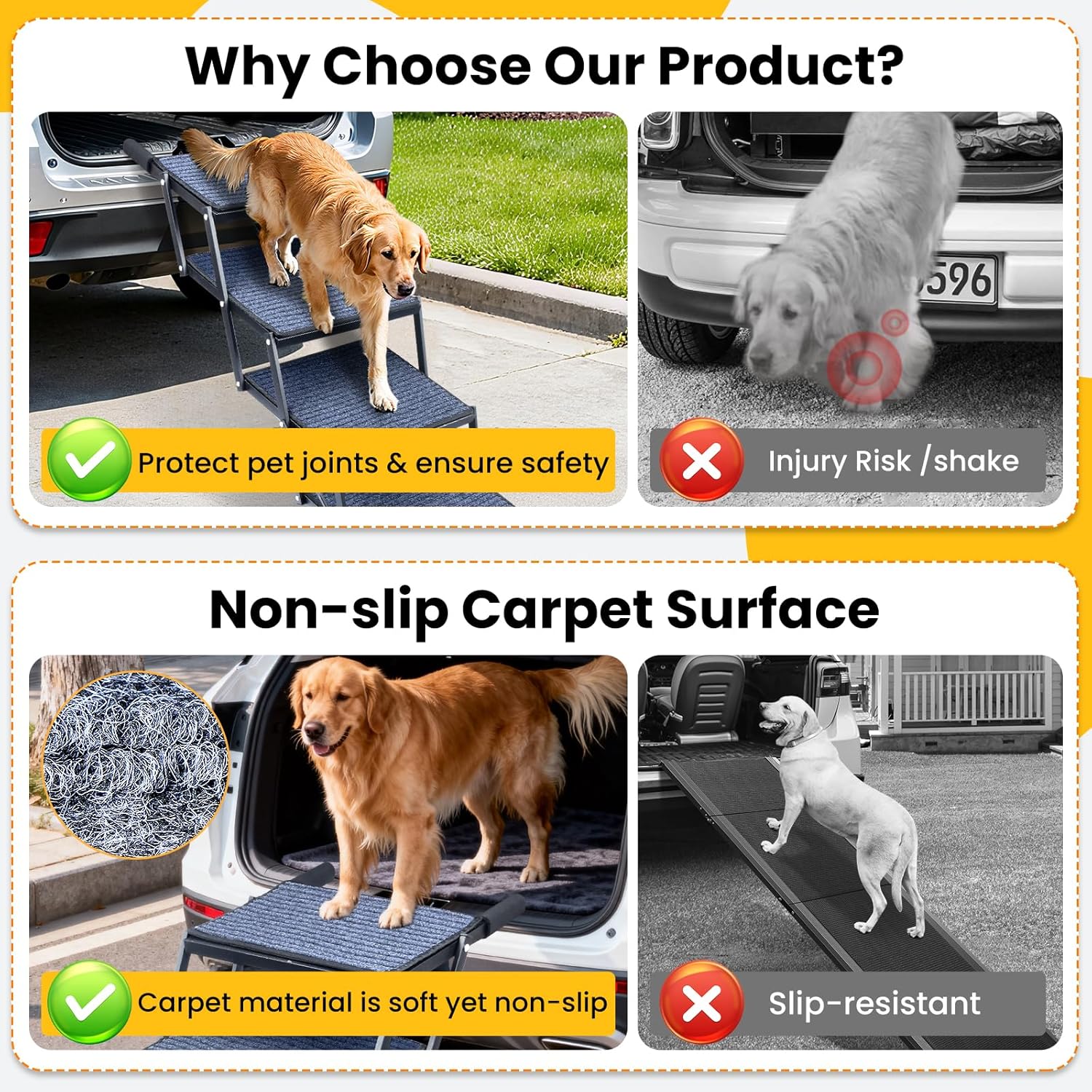 More Sturdy & Stable: The frame of the dog ramp is made of thickened sturdy metal to provide maximum stability with two external connectors on both sides. Our dog stairs for large dogs can support most medium and large dogs up to 200 lbs without bending or breaking. Perfect for large, elderly, injured dogs’ indoor and outdoor use