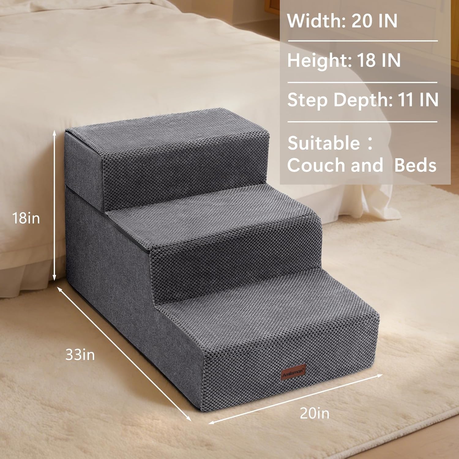 Designed for Medium & Large Dogs – Wider, deeper and taller steps make climbing safer and easier. Each step is 20″ wide and 11″ deep, providing stable footing for dogs getting on beds or couches. Overall size: 33″L x 20″W x 18″H