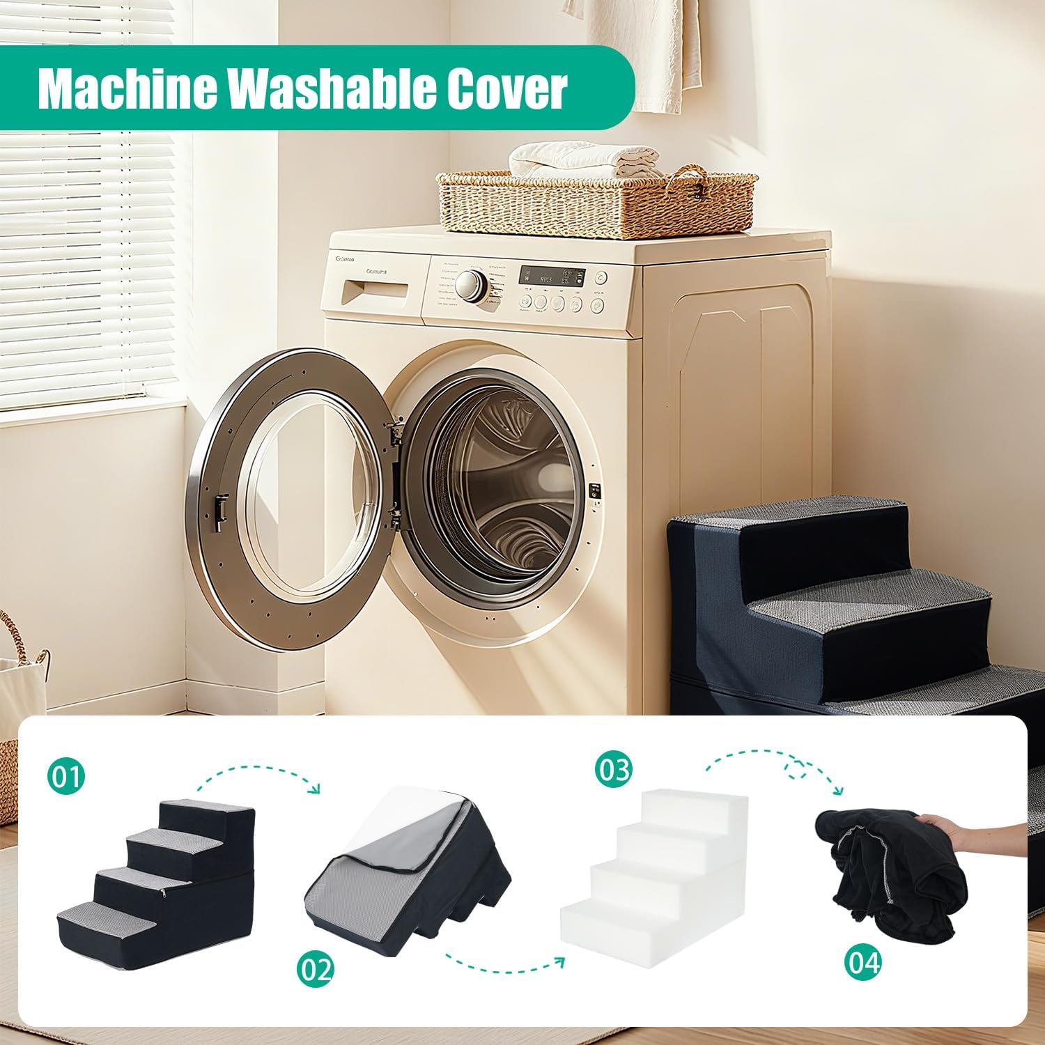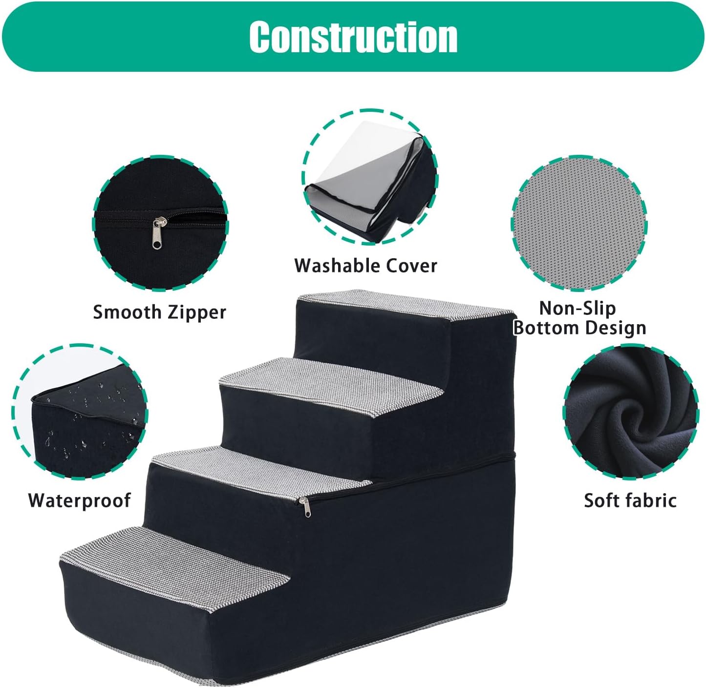 [Removable & Machine Washable Cover]: The cover of these foam dog stairs features a combined grid fleece and chenille fabric design, equipped with smooth gliding zippers for hassle-free removal and cleaning. Simply hand wash or machine wash as needed to effortlessly maintain hygiene for your doggy steps for bed.