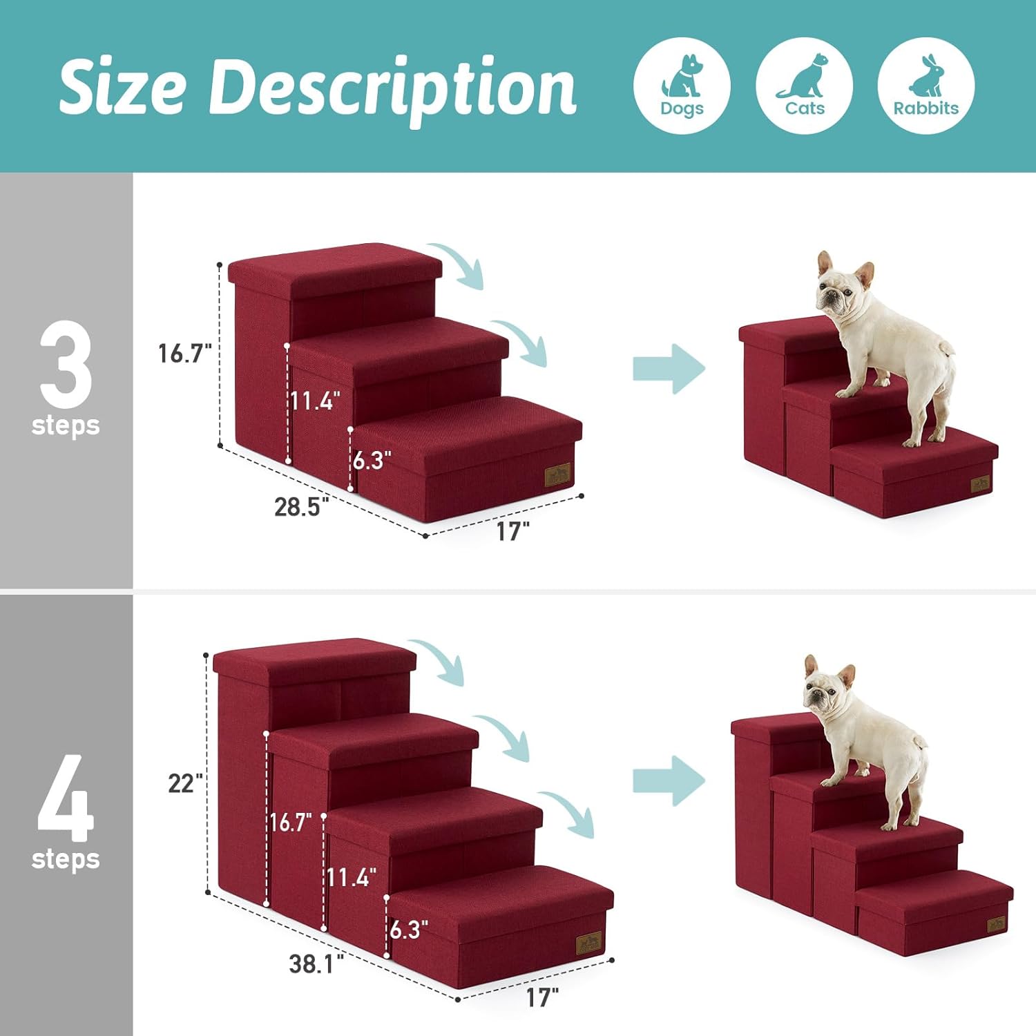 Dog Stairs with Storage, 3-Step Wider Sturdy Dog Steps for Small/Medium/Large Dogs and Older Cats, Folding Doggie Ramp for Bed/Couch/Car Hold Up to 180 lbs (16.7″ H, Burgundy)