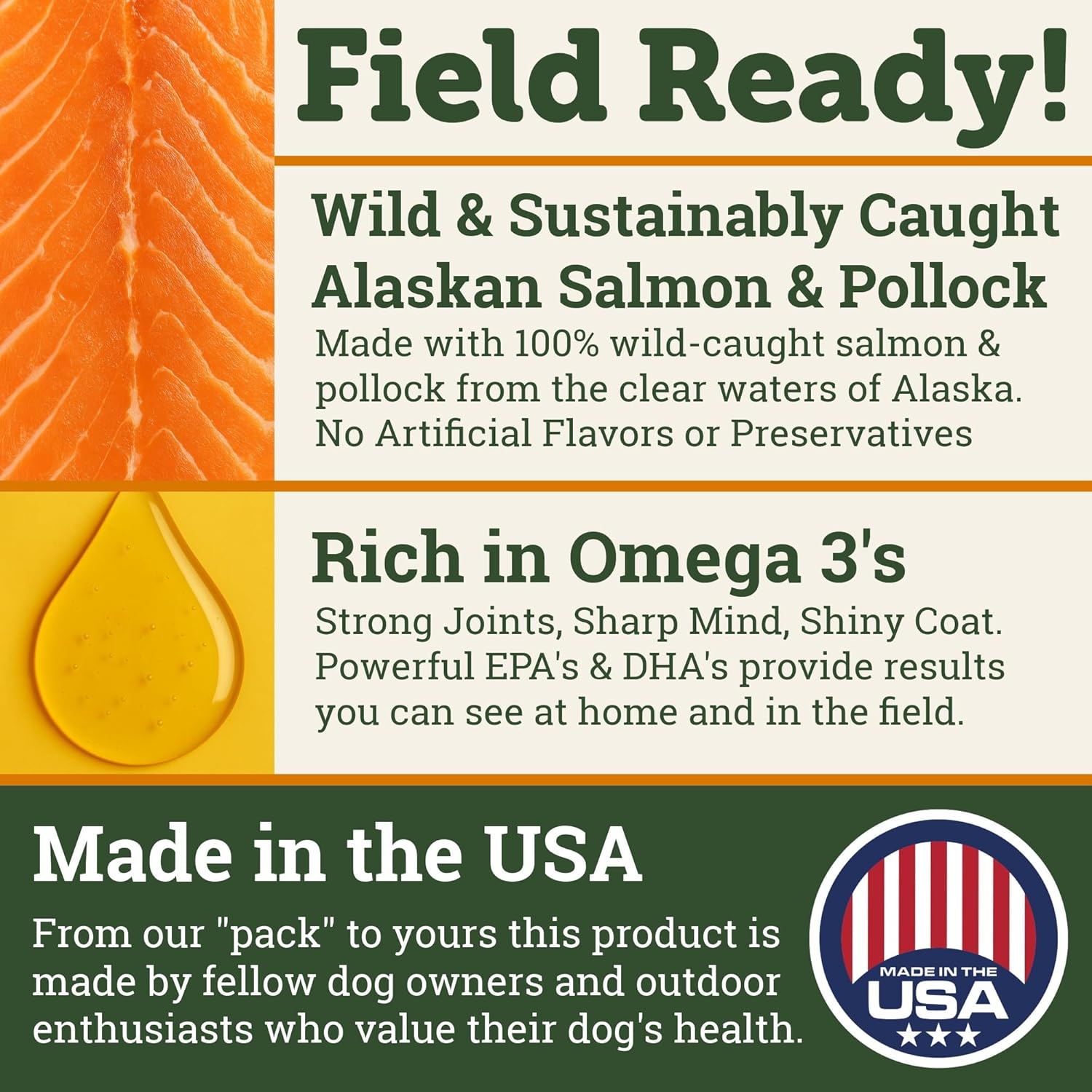 100% Wild Caught Salmon – DogBone Fish Oil is proudly made in the USA with sustainably caught salmon and pollock from the pristine waters of Alaska, from our dogs to your own we ensure the highest quality supplements for our companions