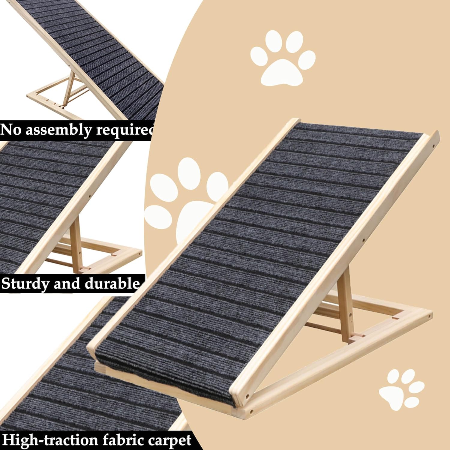 【ANTI-SLIP CARPET FOR SAFETY】: The high-traction fabric carpet with built-in grooves provides superior grip, preventing slips and helping pets feel secure as they climb. The base also includes a non-slip mat to keep the ramp stable and protect floors from scratches