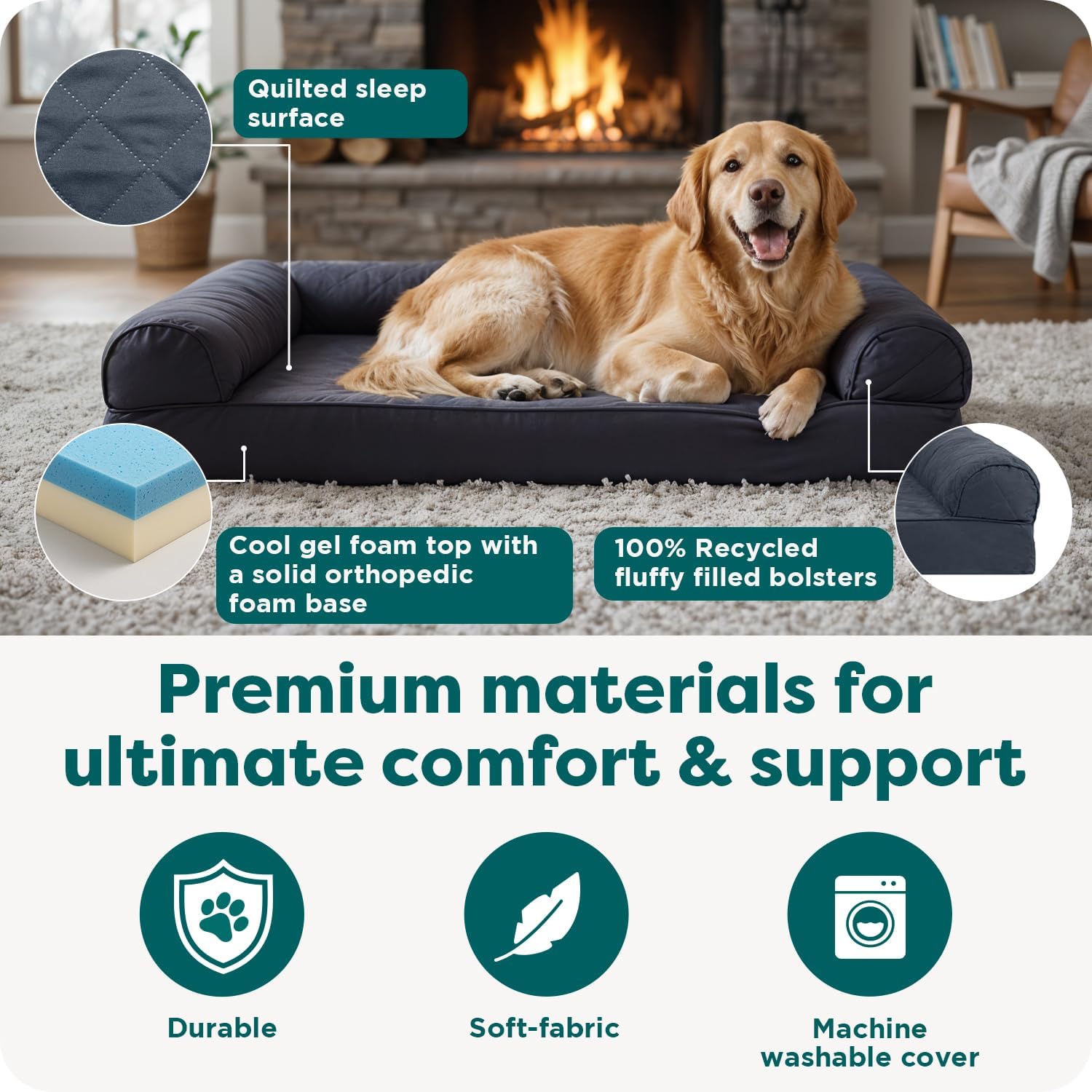 Furhaven Cooling Gel Dog Bed for Large Dogs w/ Removable Bolsters & Washable Cover, For Dogs Up to 95 lbs – Quilted Sofa – Iron Gray, Jumbo/XL
