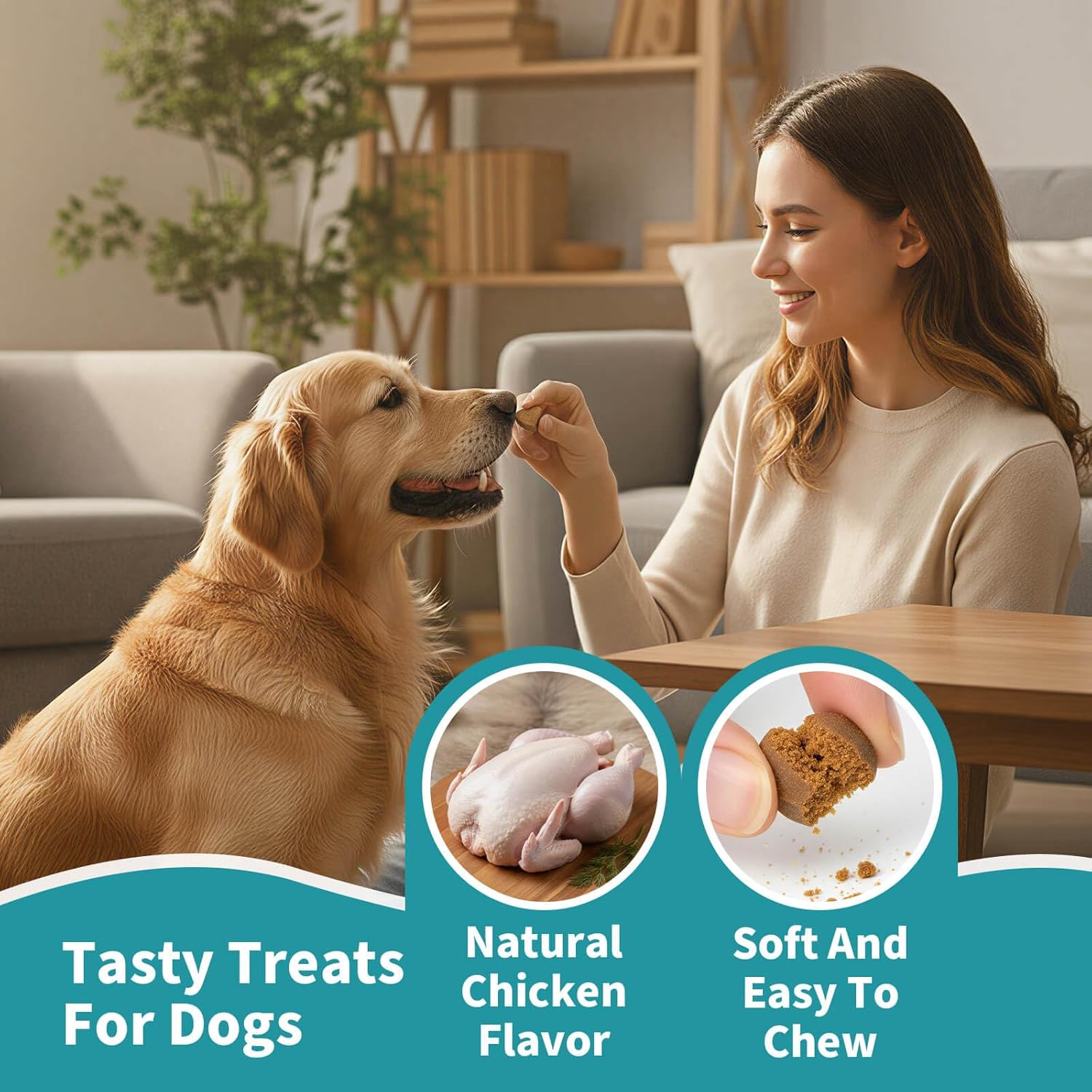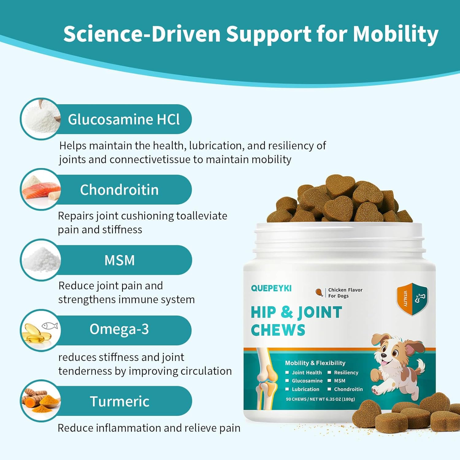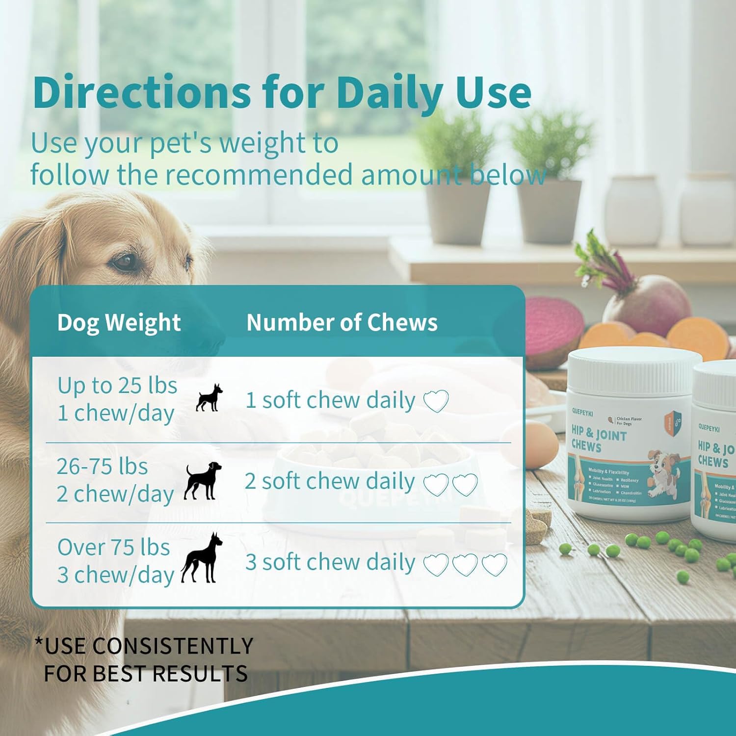 TASTY SOFT CHEWS + CLEAR DAILY SERVING BY WEIGHT – No hard tablets or powders—our soft chews are real chicken flavor and picky-eater friendly. Suggested daily serving: Up to 25 lbs: 1 chew/day; 26–75 lbs: 2 chews/day (most common); Over 75 lbs: 3 chews/day. 90 chews = 45-day supply for most dogs.
