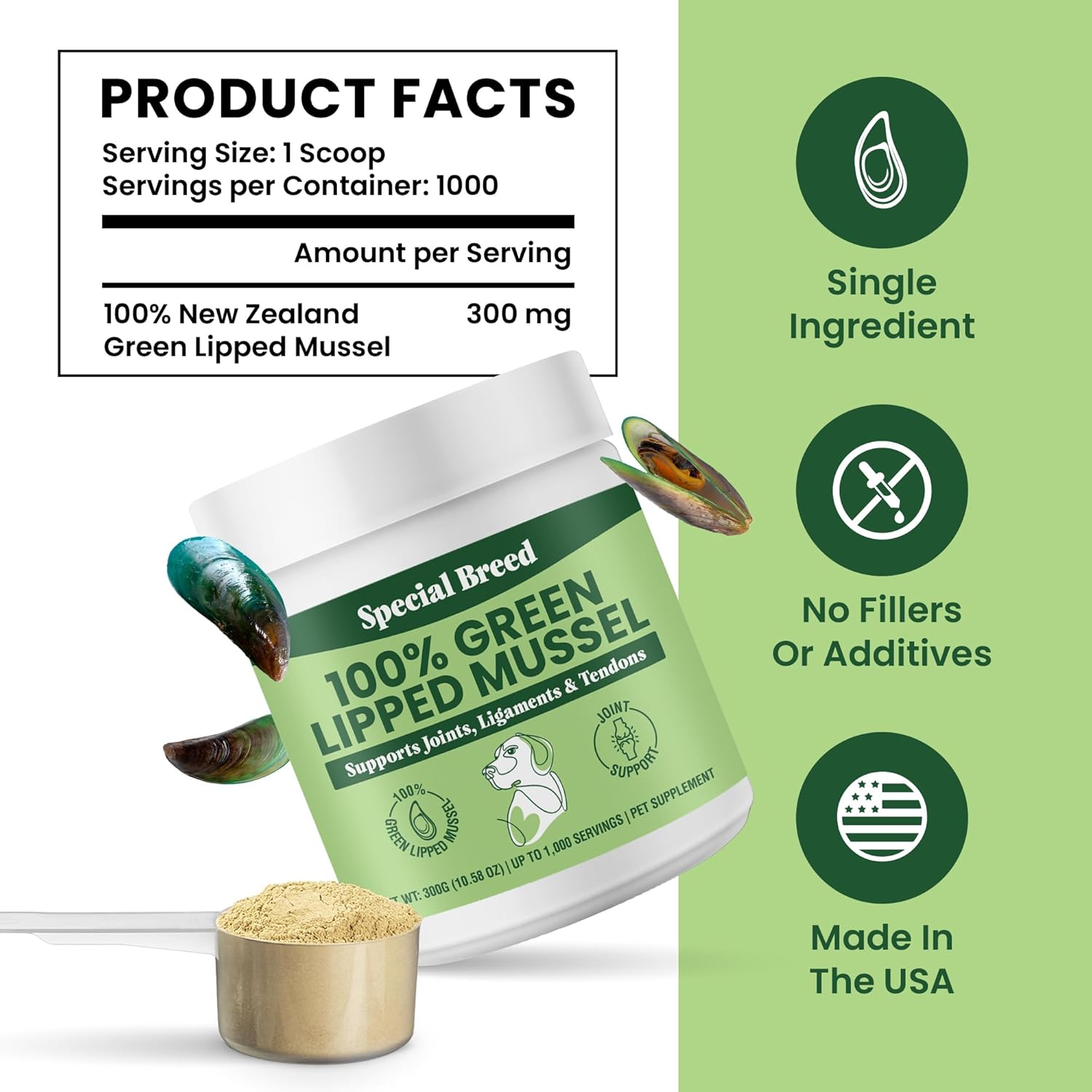 Green Lipped Mussel Powder for Dogs & Cats – 100% New Zealand Green Lipped Mussels – Natural Hip & Joint Supplement for Joints, Tendons, Ligaments, Muscles – 300 Grams – Up to 1,000 Servings