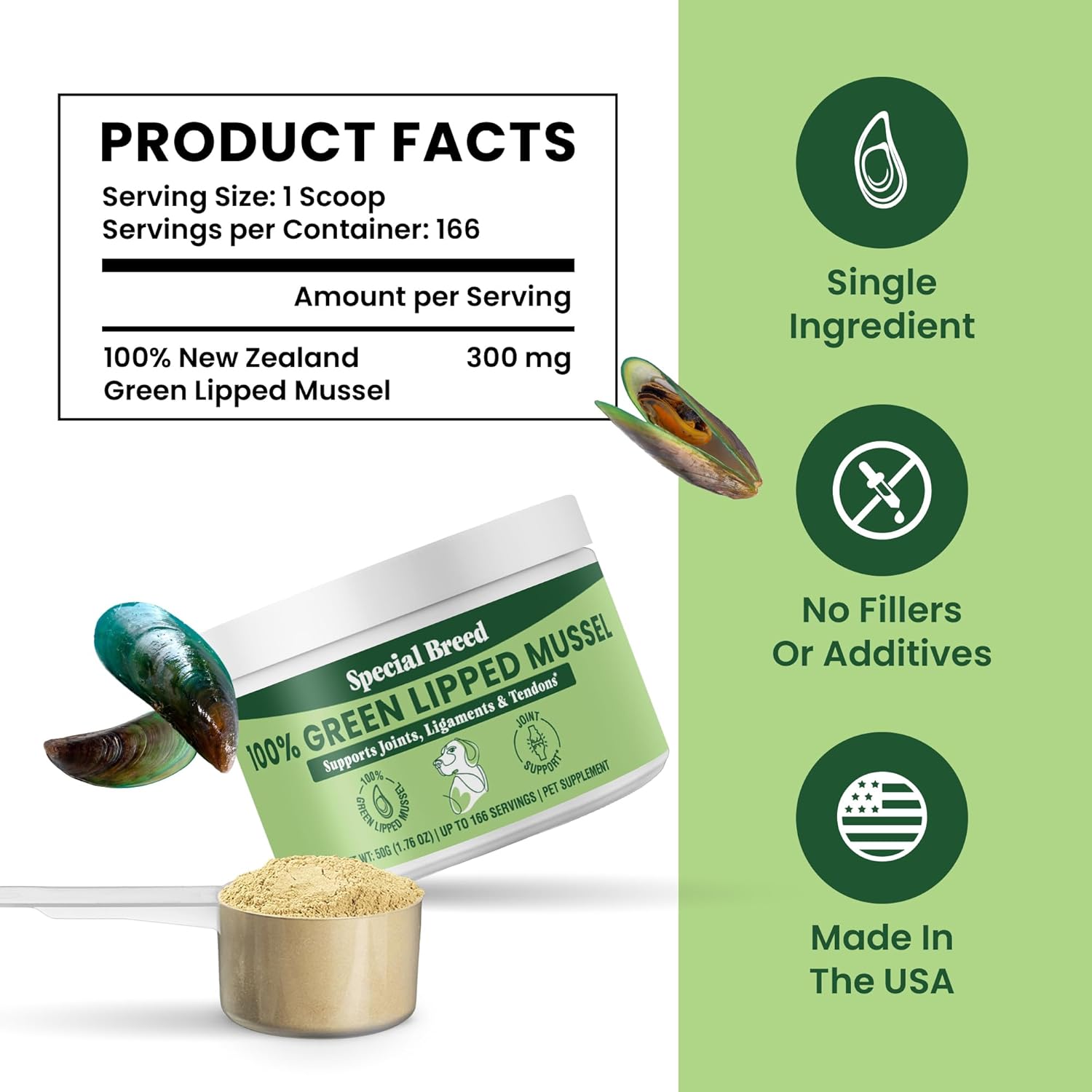 Green Lipped Mussel Powder for Dogs & Cats – 100% New Zealand Green Lipped Mussels – Natural Hip & Joint Supplement for Joints, Tendons, Ligaments, Muscles – 50 Grams – Up to 166 Servings
