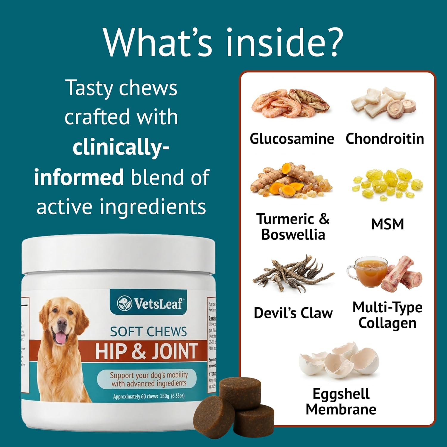 ADVANCED JOINT SUPPORT FOR STRONGER MOBILITY AND FLEXIBILITY – VetsLeaf Hip & Joint Dog Chews deliver a powerful blend of Glucosamine, Chondroitin, MSM, and Collagen to help strengthen joints, lubricate cartilage, and support bone density. These essential compounds work together to promote long-term joint resilience in dogs of all ages.