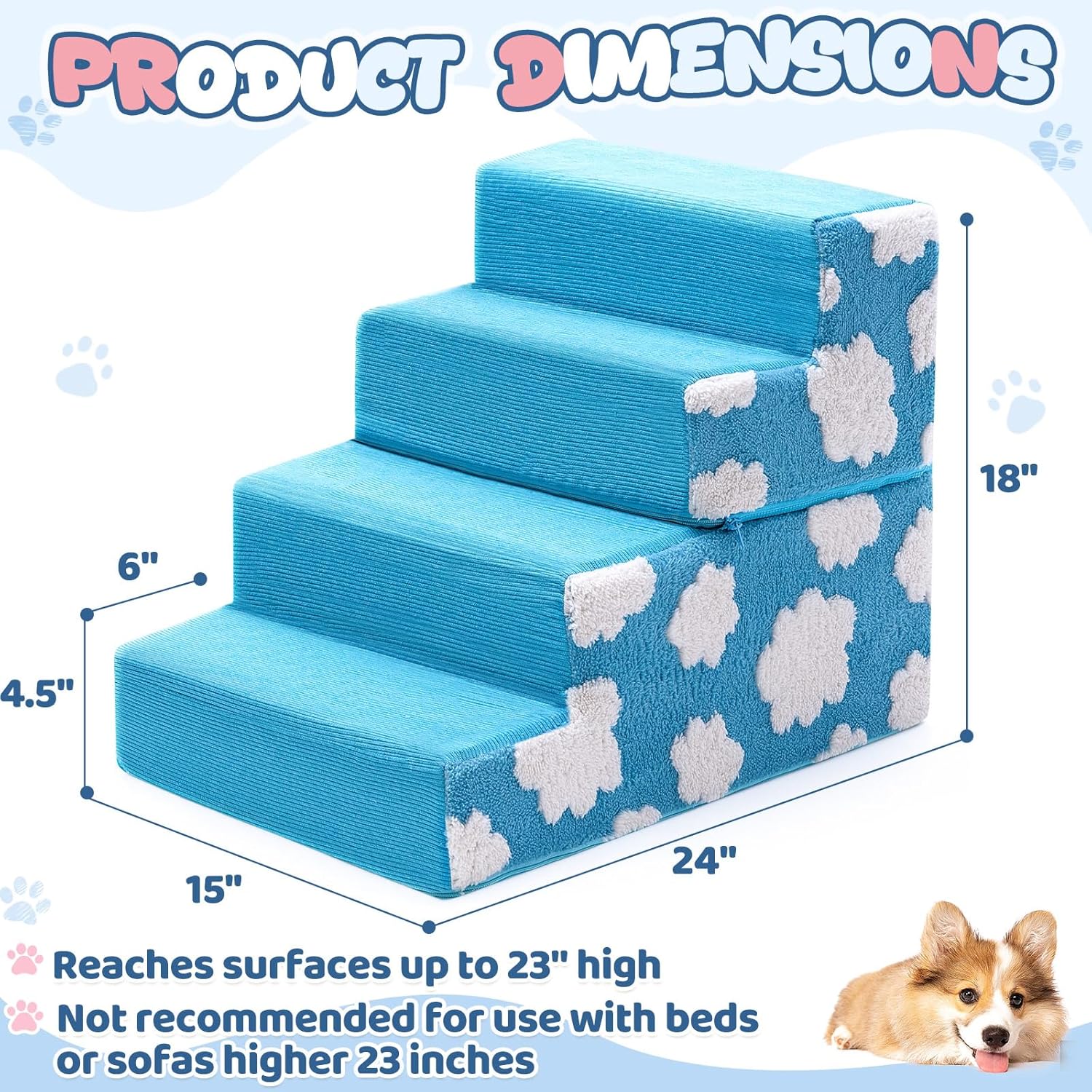 Suitable Size: dog steps for bed is a 4 step model with a height of 18 inches, which can easily enter the sofa or bed and is suitable for beds of medium height (no more than 23 inches in height); It is connected by a zipper in the middle and can also be divided into two two step stairs to use; Note: after removing from the vacuum sealed package, please wait 24-72 h (hours) for the foam to fully expand to ensure your pet gets the best comfort