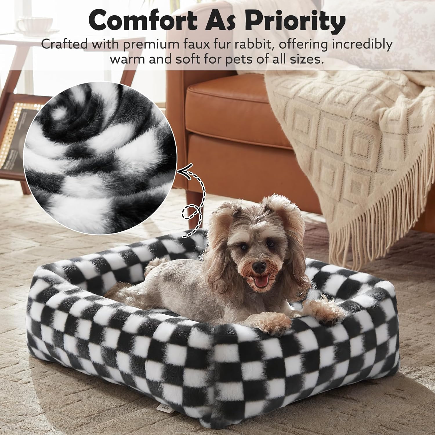 ULTRA-COZY DOG BED: Our dog bed crafted with premium faux fur rabbit, known for being one of our most comfortable fabrics. Offering incredibly warm and soft for pets of all sizes. Your pet will love snuggling up in this plush, cozy spot.