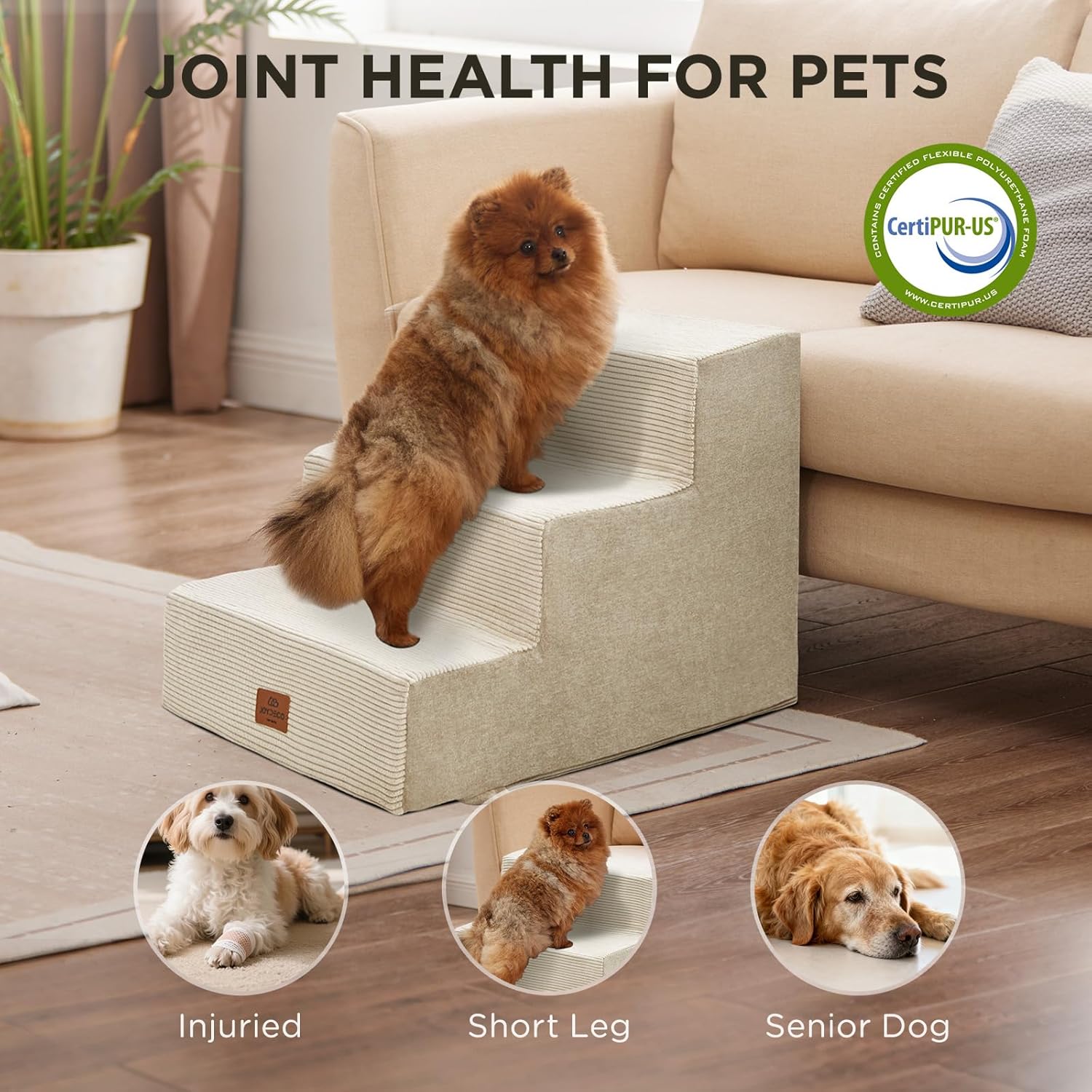 Joydeco Dog Stairs for Bed 15″ H, 3-Step Pet Steps for Small Dogs and Cats, Dog Steps for High Bed, Non-Slip Balanced Ramp Indoor Pet Stairs, Beige
