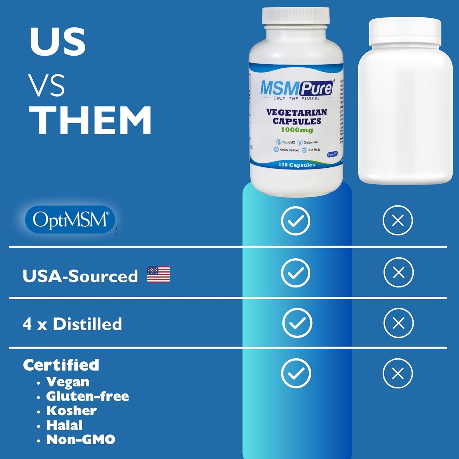High-Quality Ingredients: MSMPure uses OptiMSM a purified form of MSM that undergoes a proprietary 4-stage distillation process to ensure 99.9% purity. GRAS-designated, Kosher, Halal, non-GMO, gluten-free, and vegan. Manufactured in the USA for safety and efficacy.