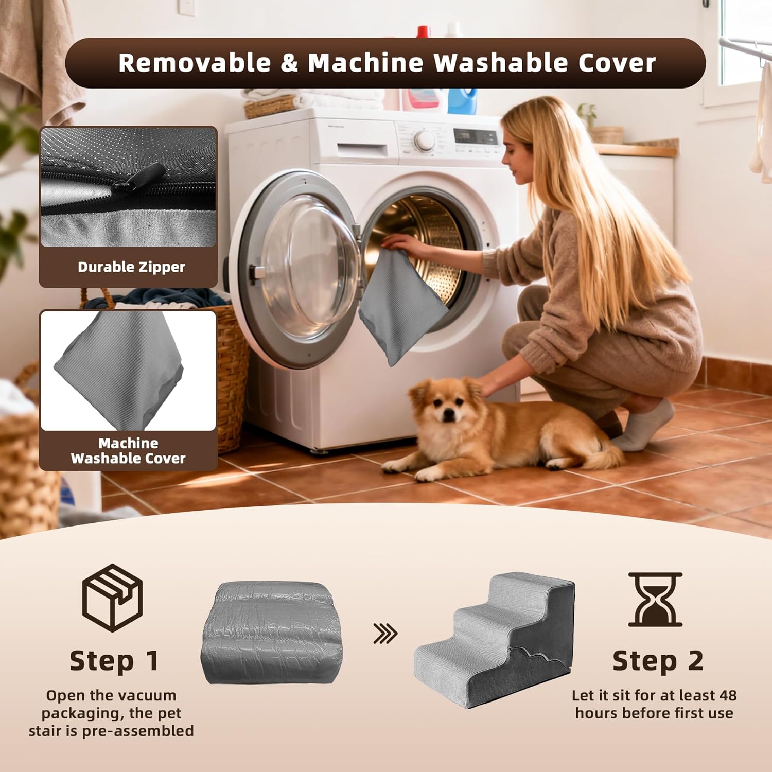 Mestuel Dog Stairs for Small Dogs Cats, Small Pet Stairs Steps, Foam 3-Tier Pet Stairs Steps for Couch Sofa, Dog Ramp Ladder Indoor with Nonslip Bottom &Washable Cover, Beige