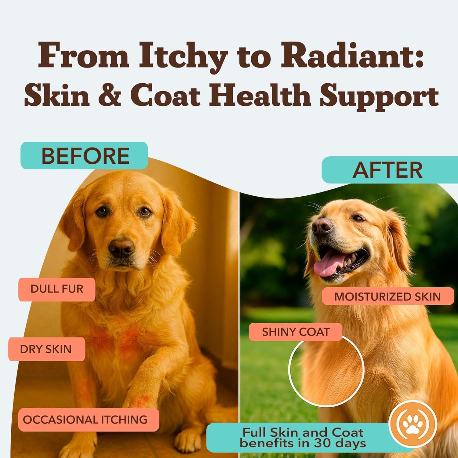 HEALTHY SKIN & SHINY COAT SUPPORT: Formulated with Omega-3 fatty acids from wild Alaskan salmon oil, plus Biotin and Vitamin E, to nourish your dog’s skin from within and promote a soft, shiny coat. This daily skin and coat supplement helps support natural moisture balance and healthy skin function for dogs of all breeds, sizes, and life stages, making it ideal for everyday coat care and long-term wellness.