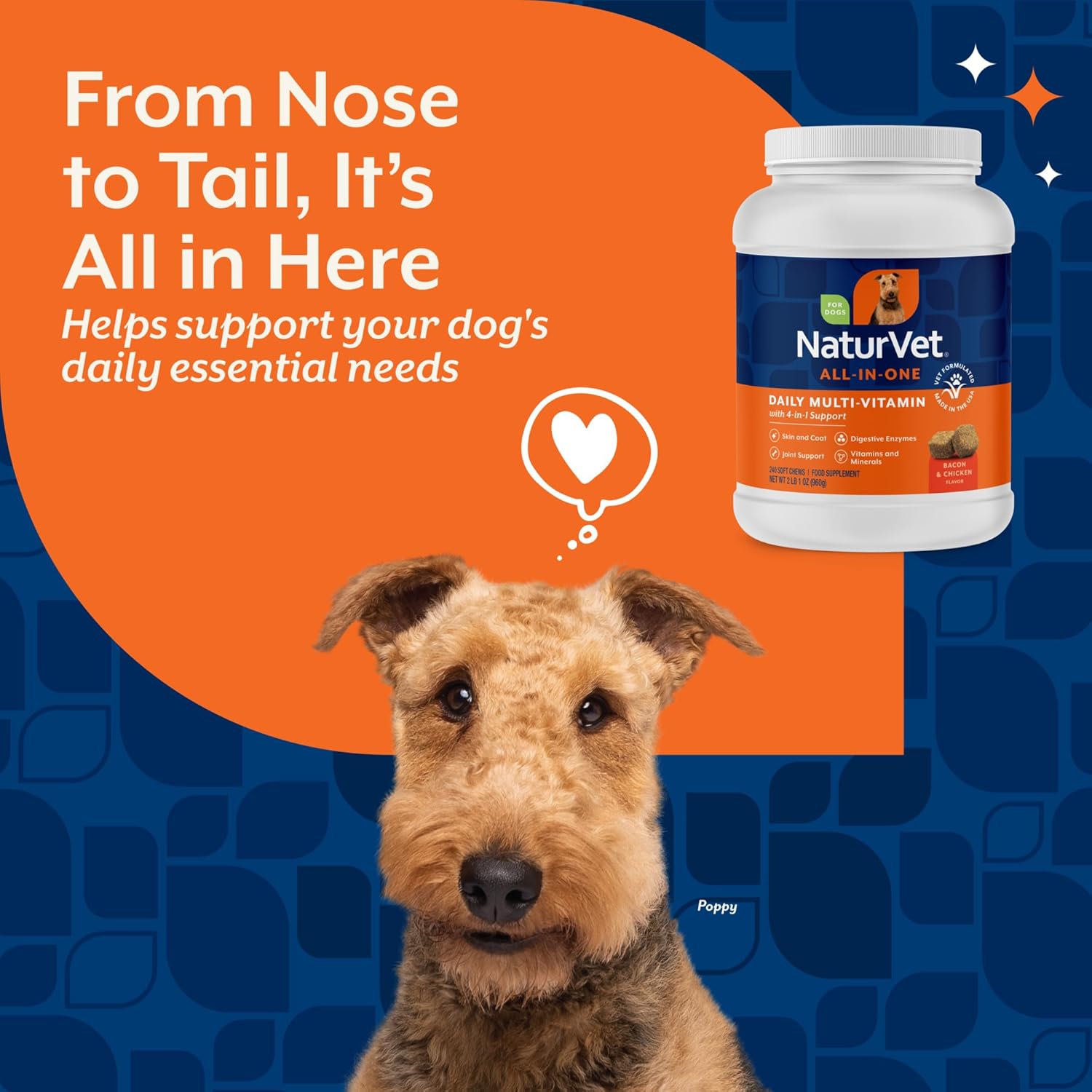 NUTRITIONAL PET SUPPLEMENTS: Ensure that your canine companion receives the nutrients he needs with these All-In-One wheat-free dog supplements. The convenience of four products in one makes supplement time easy for you and enjoyable for your pet.