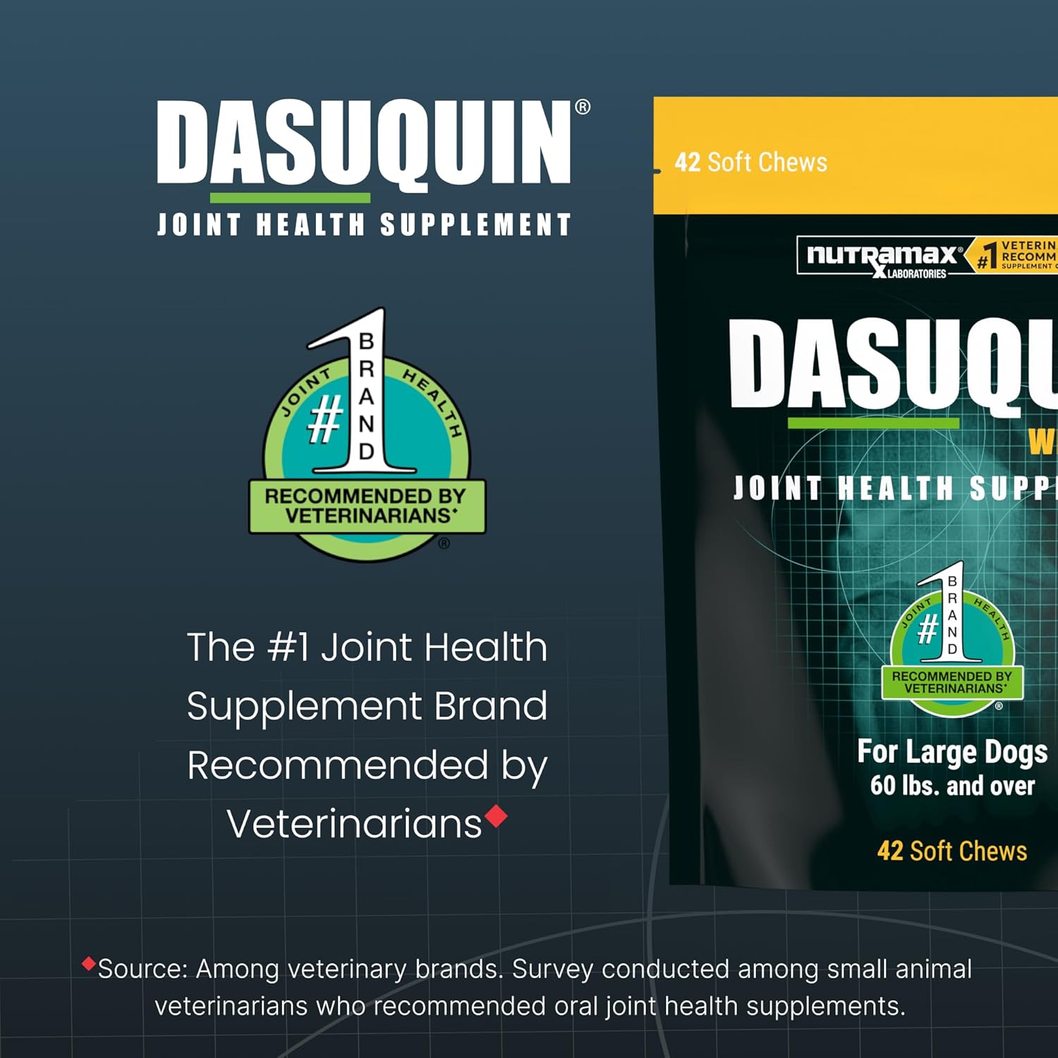 Dasuquin, the #1 veterinarian recommended joint health supplement brand◆, is a premium joint health supplement for dogs brought to you by Nutramax Laboratories Veterinary Sciences, Inc. It contains a patented combination of glucosamine hydrochloride (FCHG49®), sodium chondroitin sulfate (TRH122®), and ASU (NMX1000®) to help support your dog’s joints. Research shows that this synergistic combination of ingredients works better than glucosamine and chondroitin sulfate alone. Dasuquin is made in the United States with globally sourced ingredients. Subjected to rigorous quality checks that go beyond industry standards, Dasuquin is a trusted option to support your pet’s healthy joints. Nutramax Laboratories Veterinary Sciences, Inc. is the #1 veterinarian recommended supplement company*, has been a leader in pet health for over 25 years, providing supplements to support joint health, digestive health, skin and coat health, calming, and more. ◆Source: Among veterinary brands. Survey conducted among small animal veterinarians who recommended oral joint health supplements. *Source: Survey conducted among small animal veterinarians who recommended animal supplements.