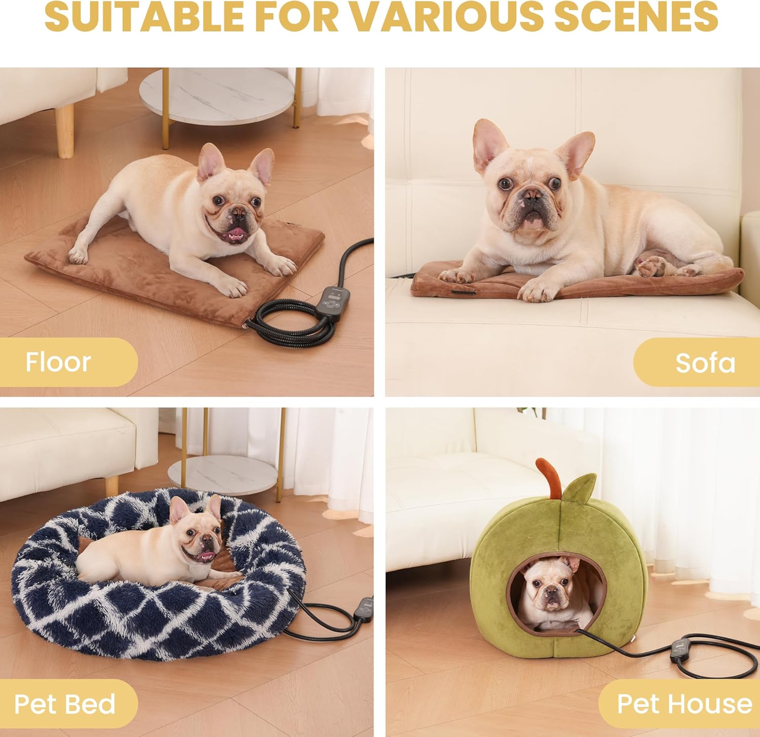 【Safe & Certified Design】 Your pet’s safety is our top priority. The pad features an 8-layer protective structure with UL-approved heating wire and MET safety certification for the entire unit —not just the components. A temperature sensor and automatic shut-off function protect against overheating, while the chew-resistant cord and waterproof, flame-retardant PVC layer ensure long-lasting safety.