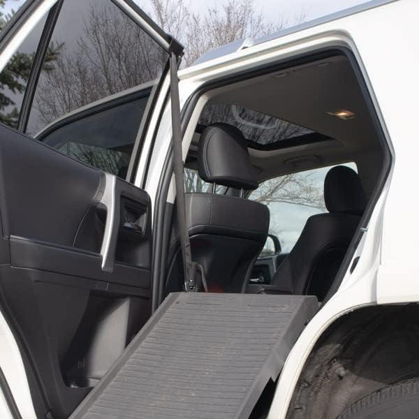 The strap is adjustable so that it will fit any vehicle’s side door. Open the clip on the strap to adjust it as needed. The strap should be taught when connected to the ramp and side door. Now the PetStep ramp is held safely in place for your dog to use it for side entry into your vehicle!