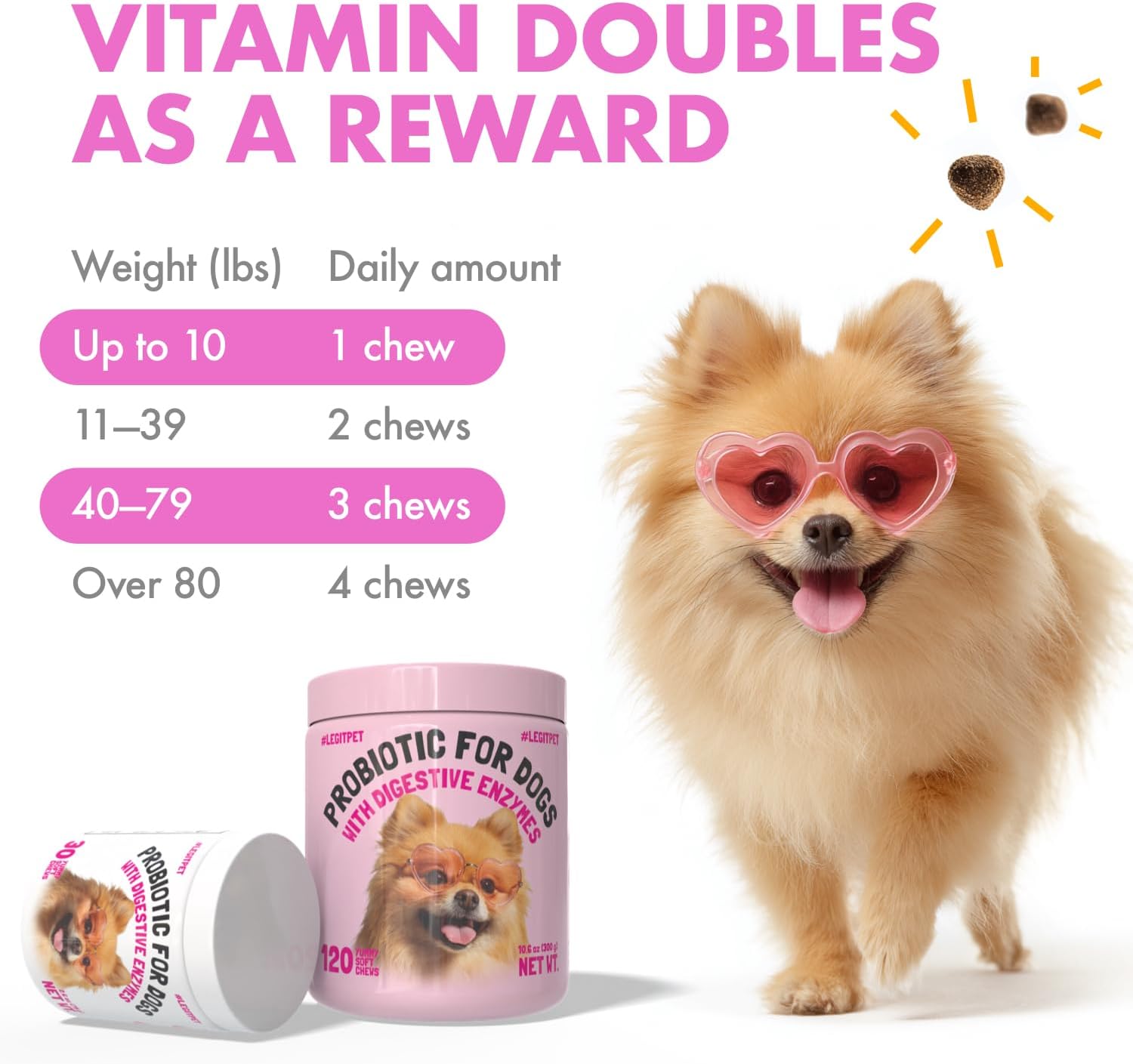 LEGITPET Dog Probiotics Chews contain 3 billion CFUs in a delicious chewable form to help dogs with gas, bloating, constipation, diarrhea, indigestion, and stomach discomfort.