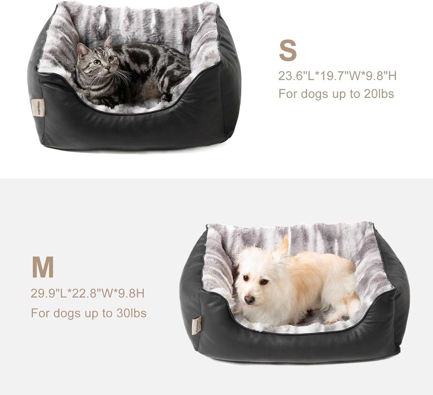PREMIUM ECO-FRIENDLY MATERIALS Crafted with high-quality, eco-conscious leather and opulent rabbit fur fabric, this pet bed is not only durable but also kinder to the environment. It offers a sophisticated look and a soft, snuggly feel that your furry friend will adore.
