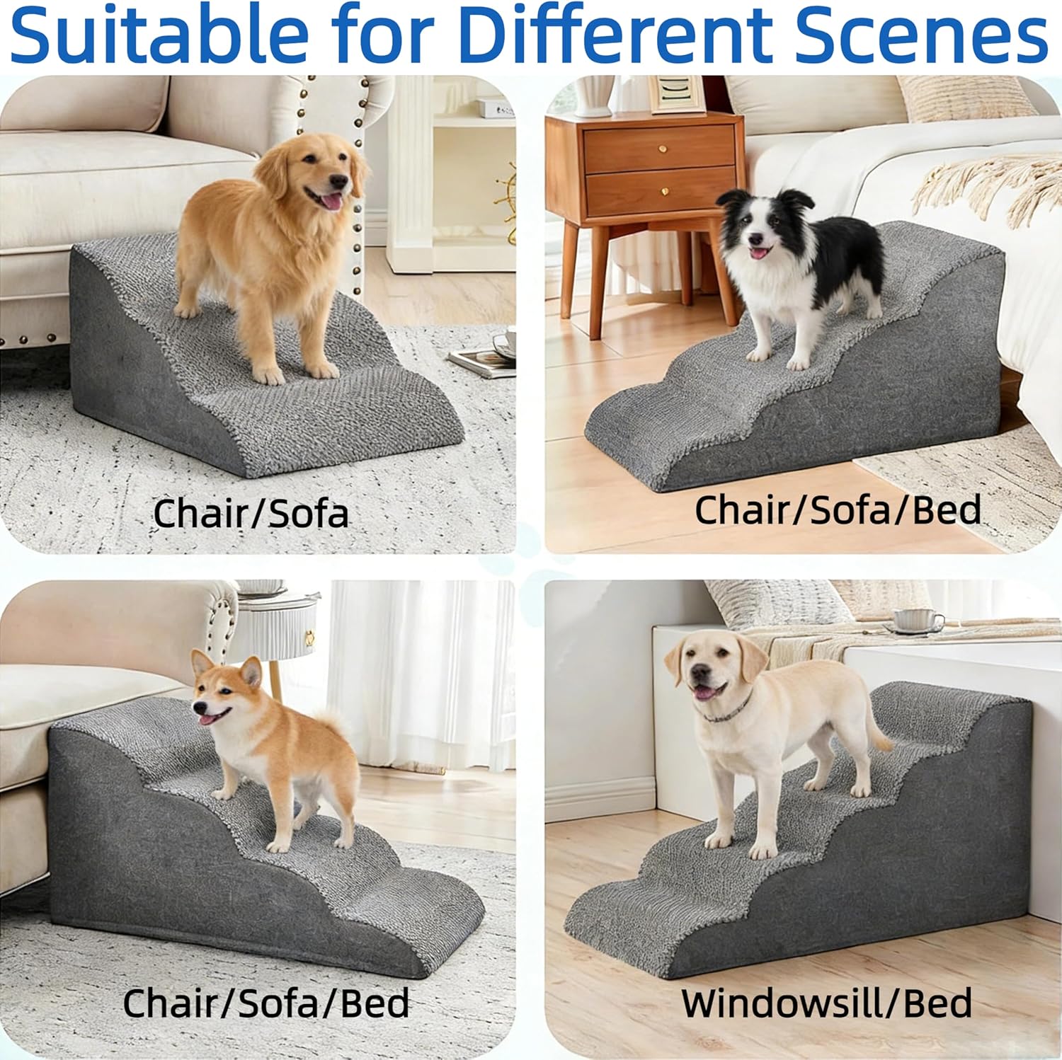 【Dog Stairs for Small Dogs】 Featuring a soft, comfortable curved design, 3-step dog steps are ideal for puppies and pets with knee issues. NOTE: This pet stair is intended for small and medium dogs, the dog stairs for bed small dogs are designed to rest against the edge of couches, sofas, and other furniture. As they are vacuum-packed, please allow 24–48 hours for them to fully expand back to their original shape