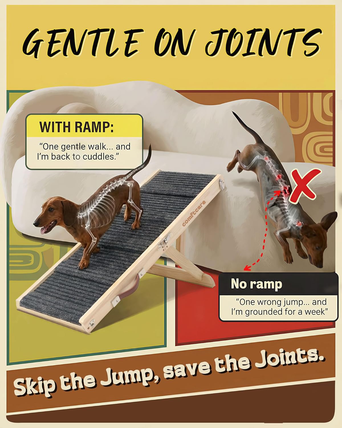 🌲 Always the Right Height: With 4 height settings (13.6″, 16.1″, 18.5″, 21″), Comftcare dog ramp for low bed, couch, or sofa helps small dogs and cats reach furniture or car seats safely. The gentle incline reduces joint pressure, ideal for senior pets, Dachshunds, French Bulldogs, and pets recovering from surgery.