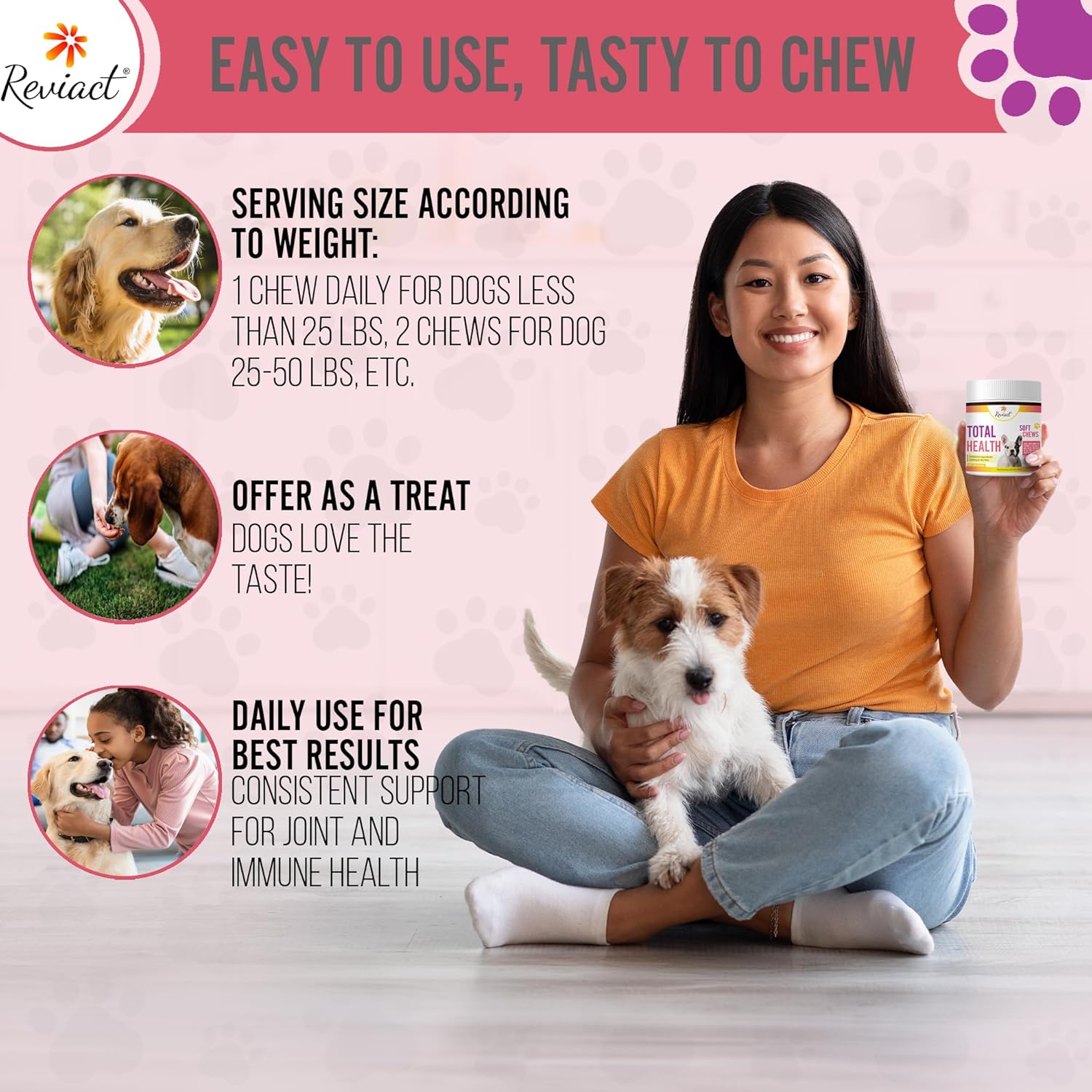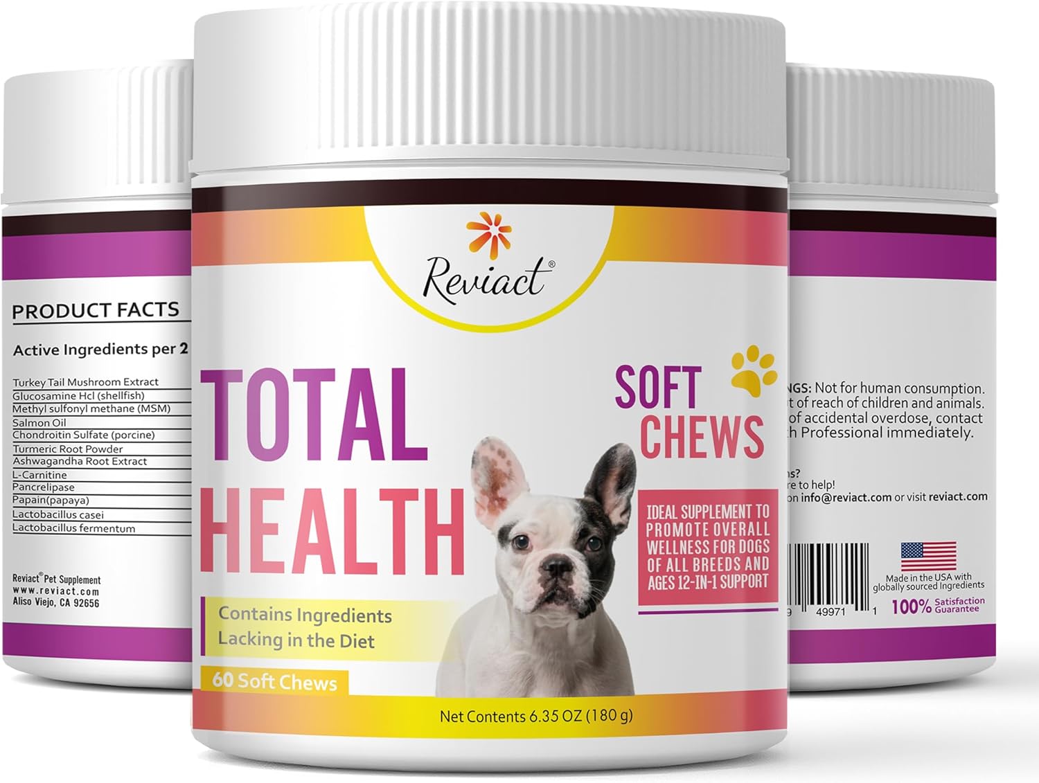 Whether you want to keep your active, support joints, or keep their coat soft and fluffy, Reviact Total Health dog chews will help you elevate your furry friend’s overall well-being. Our dog support chews use 12 key ingredients to provide multivitamins and minerals to help support the immune system, energy levels, brain, joints, skin, and more, with a delicious flavor that will keep their tails wagging! It’s packed with vitamins, antioxidants, and minerals to help your pet get the nutrients they need, whether at home or on the go every day.