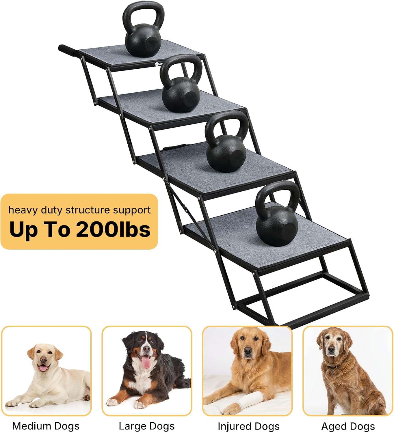 Heavy Duty Structure: Constructed with premium steel, this dog stairs for car provides excellent support, holding up to 200lbs to ensure your pet climbs safely, and the steel mesh of each step can be easily rinsed with water, simplifying cleanup